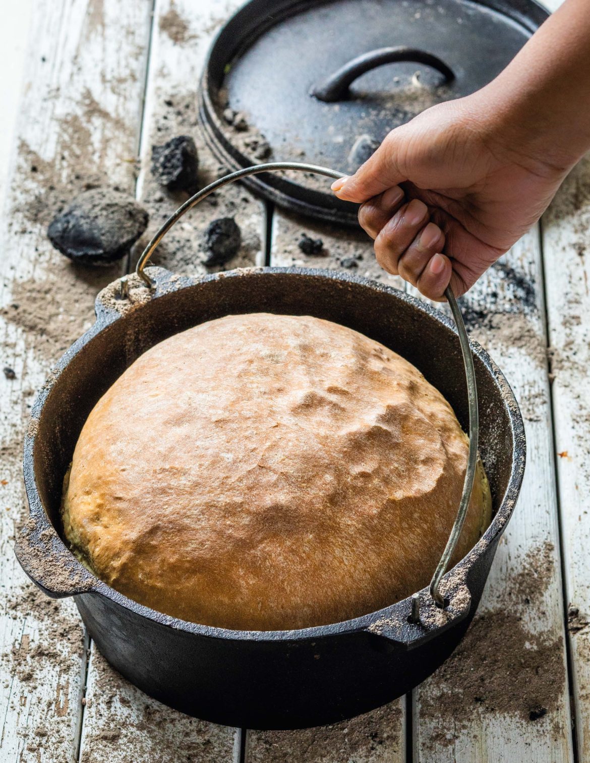 - Place pot on braai, with a few coals on the lid, and bake for 50 minutes.