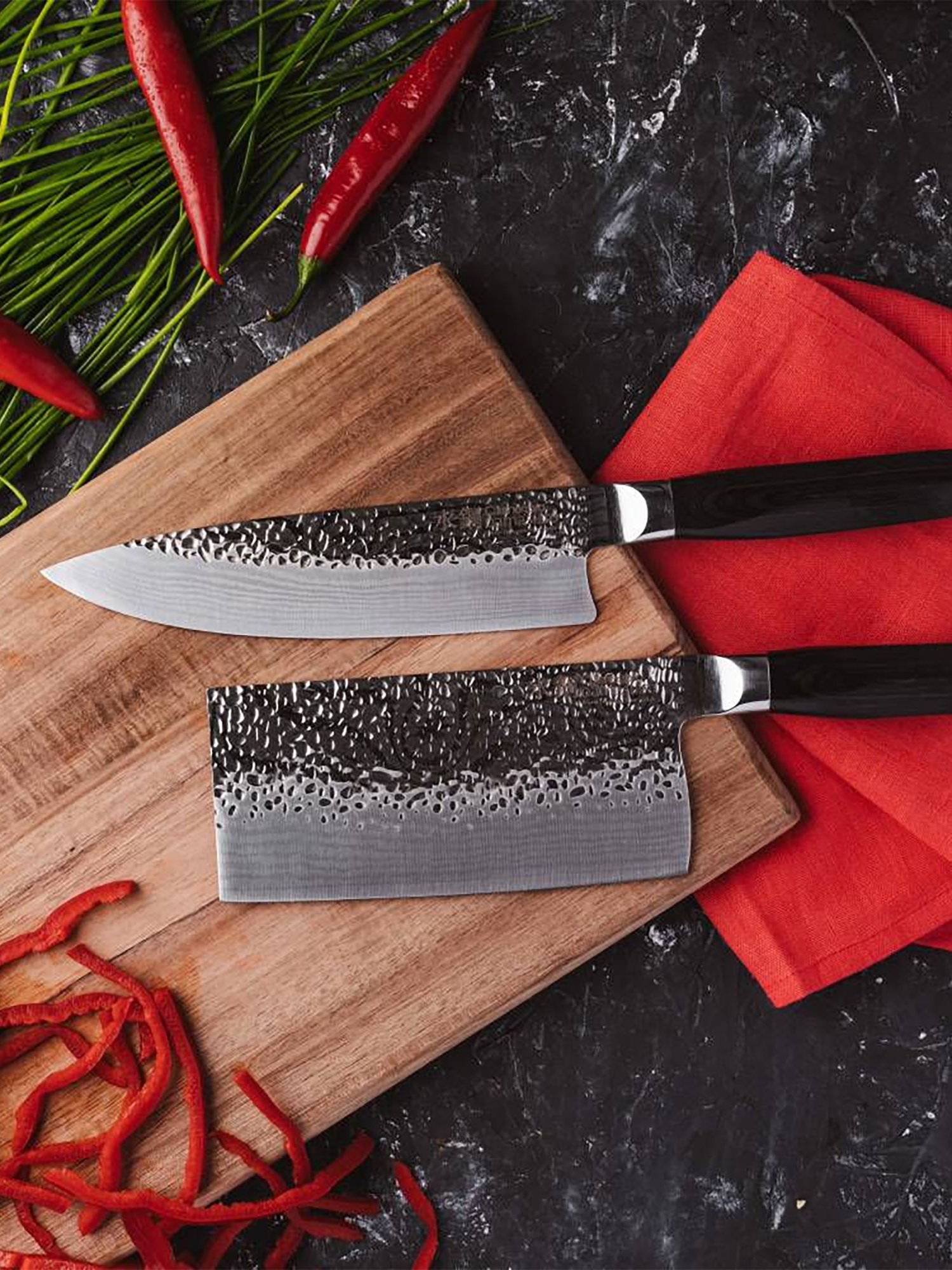 - Inspired by traditional Damascus steel with a distinctive hammered finish.