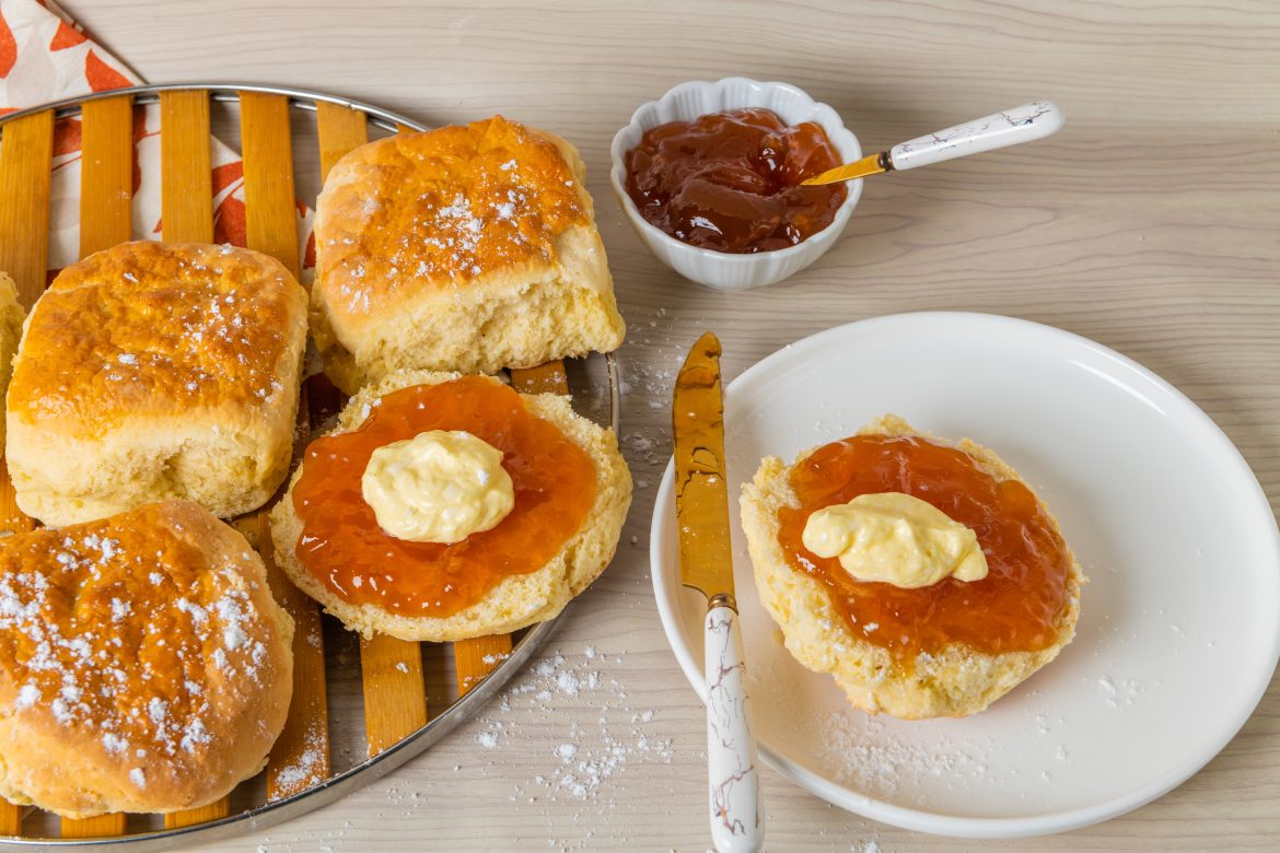 3. Place the rounds onto a greased baking tray, leaving a little space for spreading. Brush them with a beaten egg and milk mixture. Bake in a preheated oven at 200°C for 12-15 minutes. Serve warm with butter, jam, and whipped cream.
