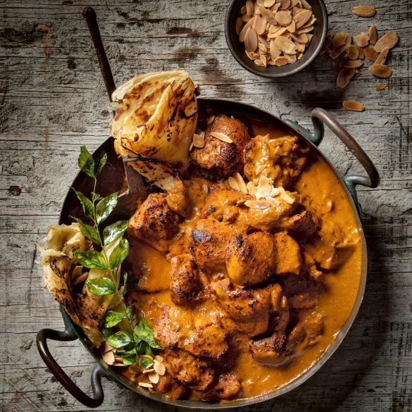 4.This step is optional, but it does give you that awesome curry house gravy result. After 20 minutes, remove the pot from the heat and use a hand blender to blitz the curry sauce until smooth. Return the pot to the heat and add the chicken. Stir in the crème fraîche and fenugreek leaves and simmer for another 15 minutes to cook the chicken. Season to taste, then remove the pot from the heat, cover and let it rest for 10 minutes before serving. Serve it with naan bread or basmati rice with a sprinkle of toasted almonds and fresh coriander.