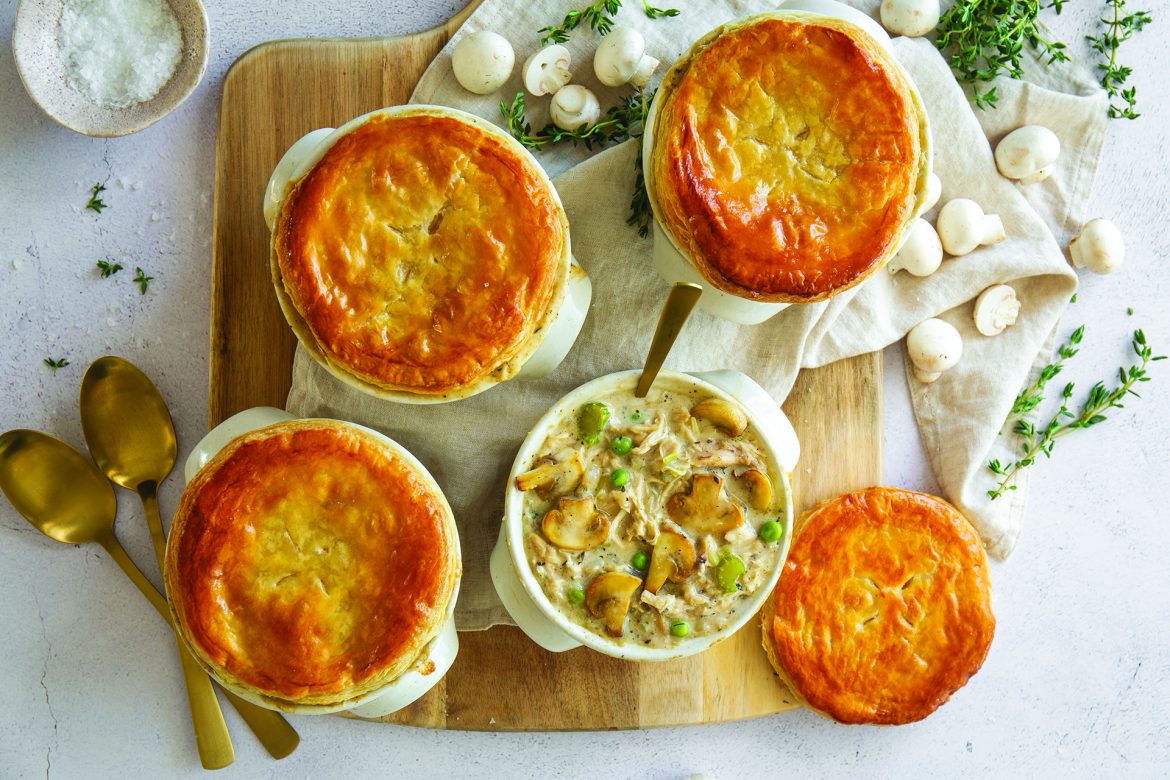 On a lightly floured surface, roll out the puff pastry slightly and cut out pie lids using the ramekins to measure.