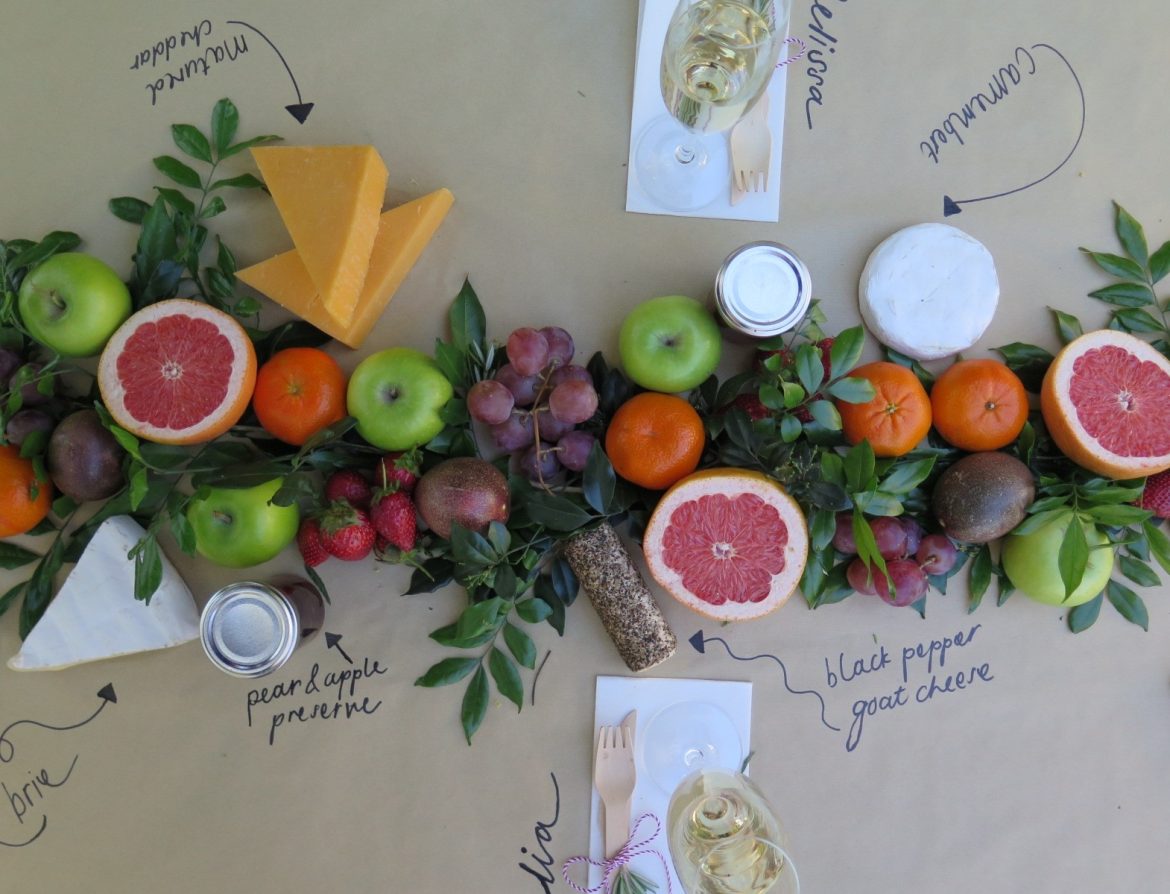 Start by placing the brown paper down the middle of the table from end to end. Add foliage and flowers and spread the fruit around and in-between – keeping in mind that you want a variety of fruit to be distributed over the whole table. Add nuts, crackers, small jars of preserves and different types of cheeses and charcuterie. Tuck a string of LED lights in and around and under the foliage to add an extra sparkle to the table. Finally, use a length of twine or ribbon to tie together a set of cutlery and add a stalk of rosemary which, besides looking good, also helps to keep away any bugs.