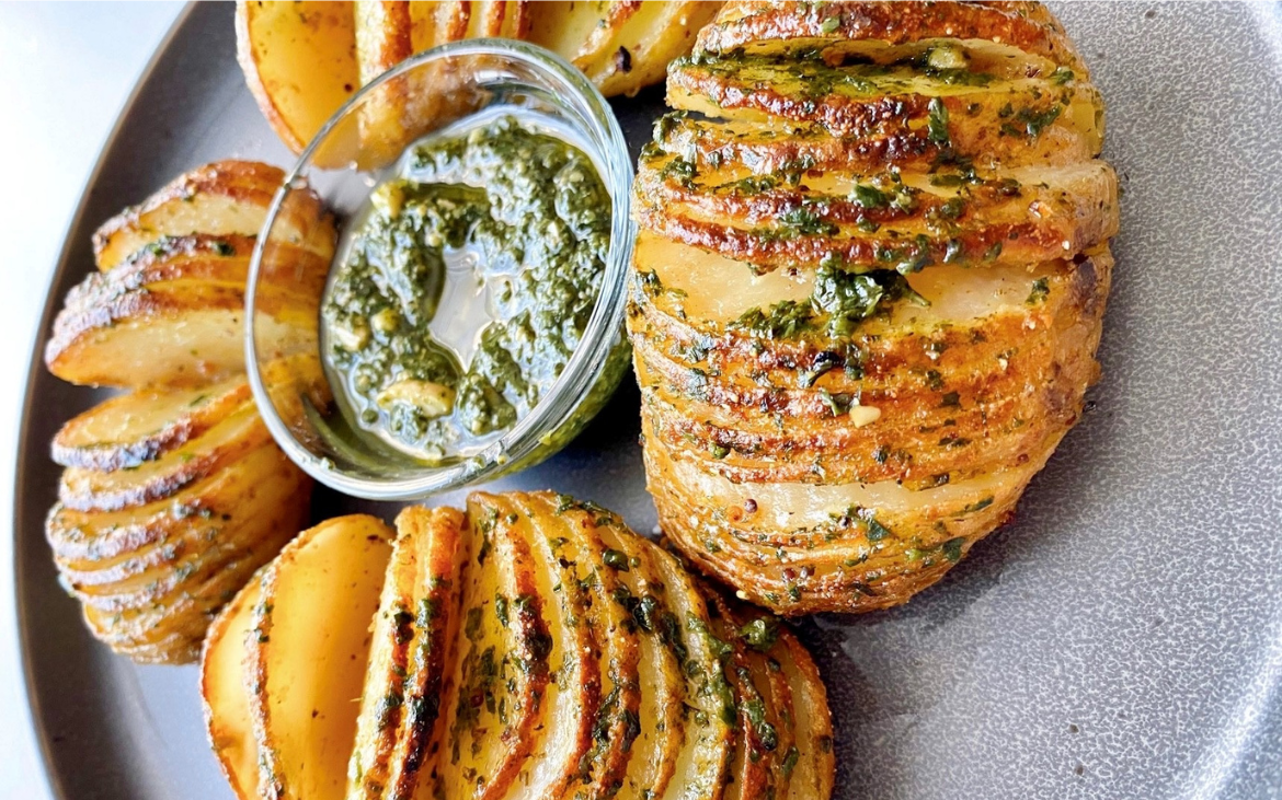- Cut the potatoes into thin and even slice, but not all the way through.