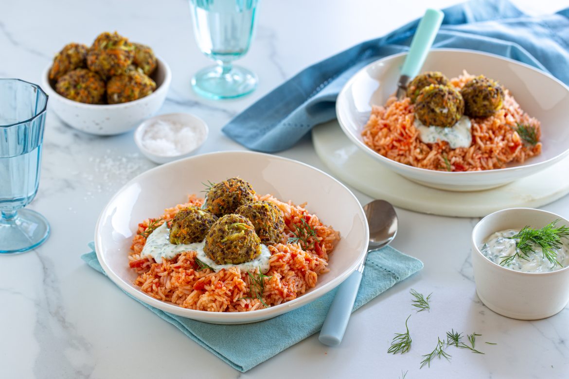- Serve fish balls on tomato rice with a dollop of herbed yoghurt sauce.