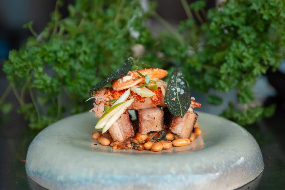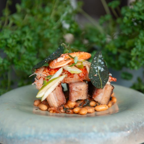 • When you are ready to plate – add your reduced tomato sauce and then your cannellini beans. On top of that place your pork belly and then the poached lobster with sliced apples to garnish and add any other herbs you may desire.