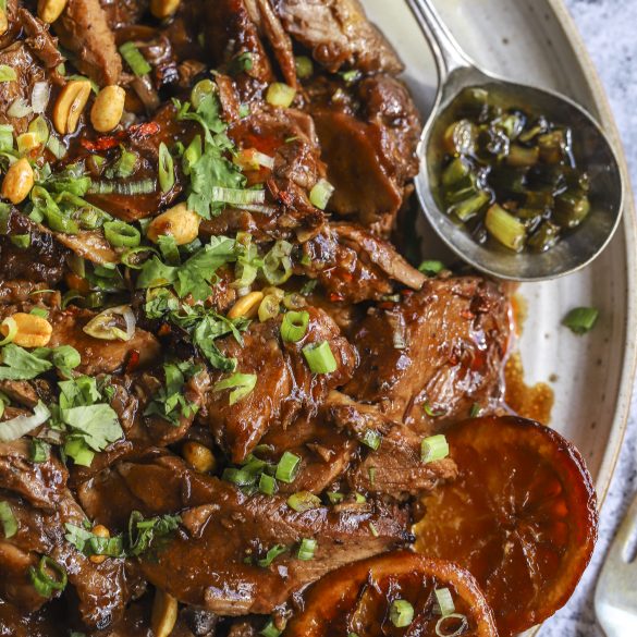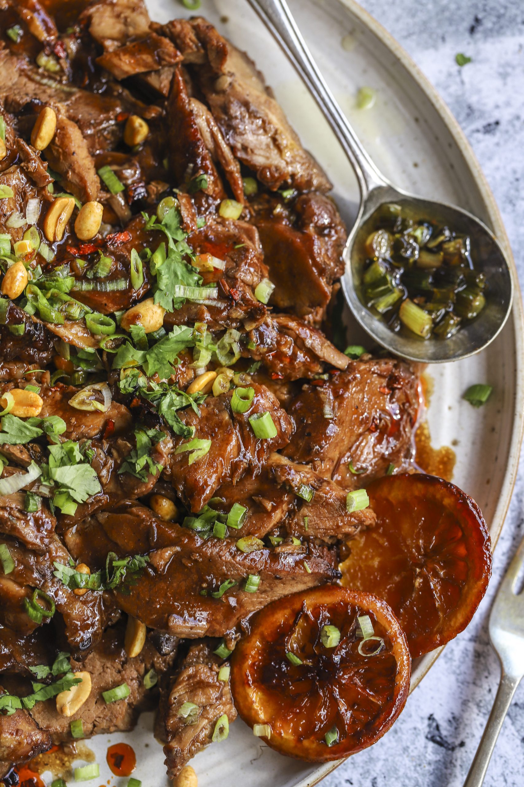 5.To serve, arrange the shredded pork on a plate and drizzle with extra marinade. Top with the fried spring onions, fresh spring onions, chopped peanuts, cilantro, and charred orange slices.