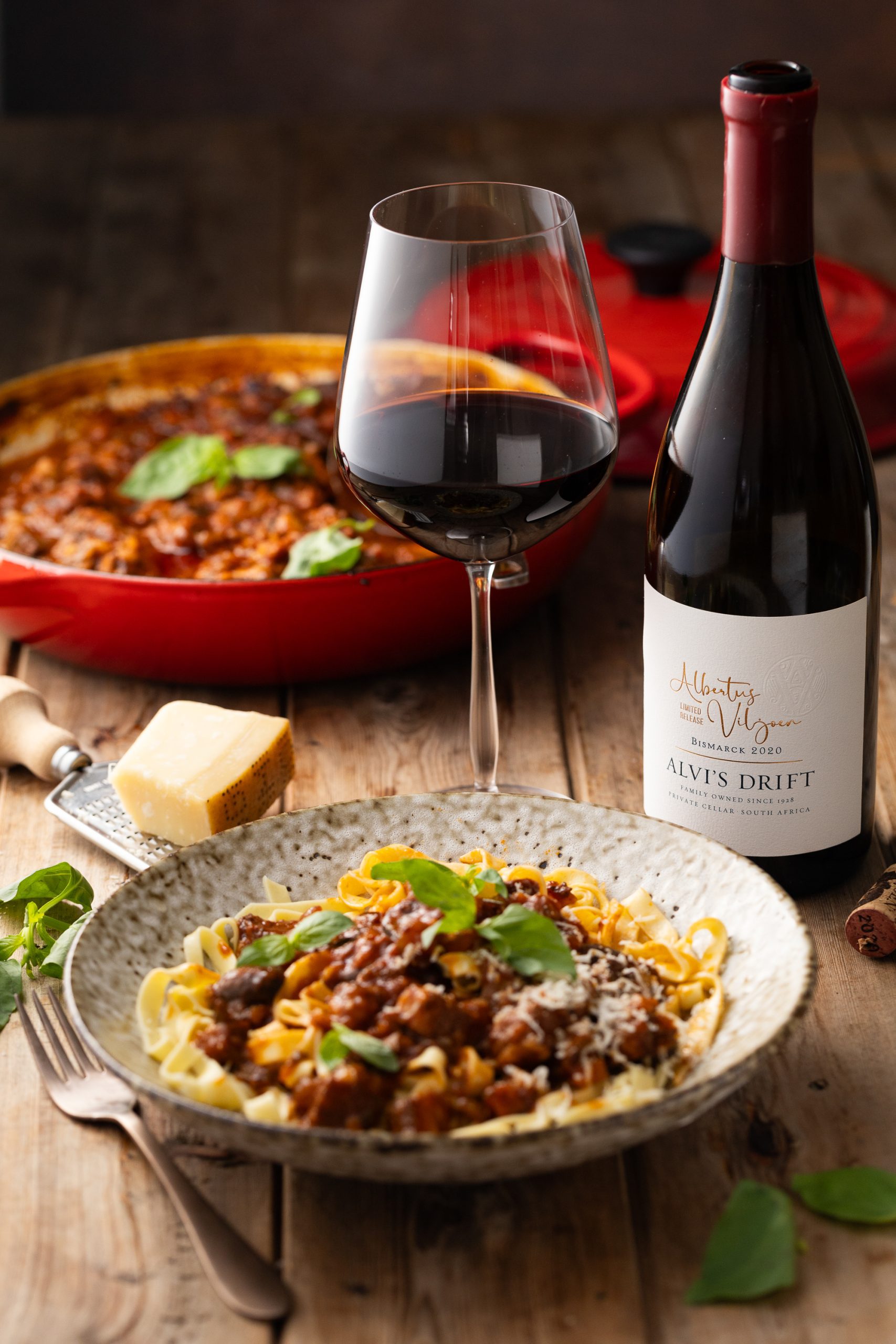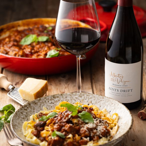 This hearty beef & mushroom ragu is a tribute to Alvi’s Drift Albertus Viljoen Bismarck 2020 from their Icon Range – a Shiraz driven red blend that also contains Pinotage, Cabernet Sauvignon, Durif, Grenache, Alicante Bouchet and a touch of Viognier. This robust, complex wine pairs beautifully with the deep umami tones of a slow braised Italian-style ragu, served with freshly made pasta and a grating of aged parmigiano.