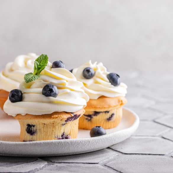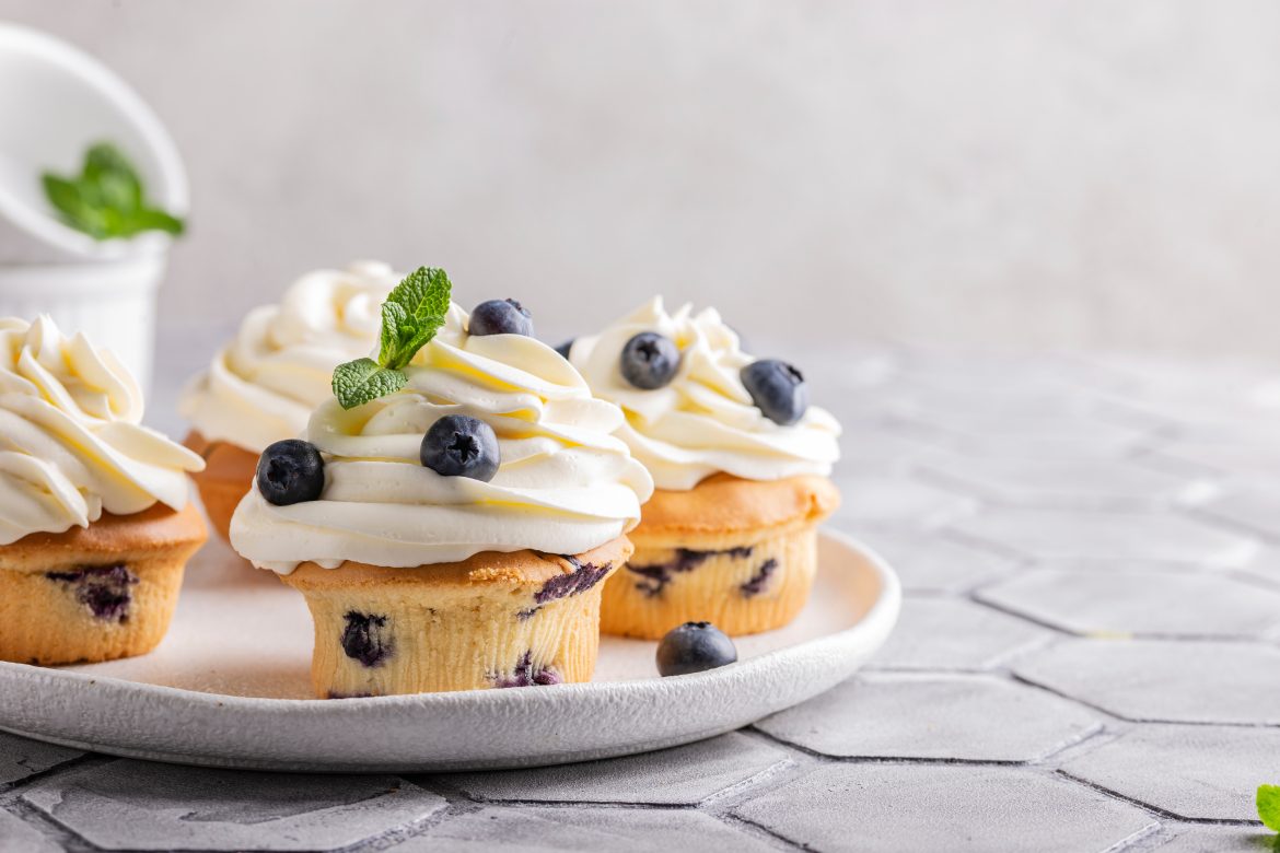 4.For the frosting, blend the cream cheese into the icing sugar and mix thoroughly until smooth. Spoon a little on top of each cupcake and garnish with the remaining blueberries. Let it set.