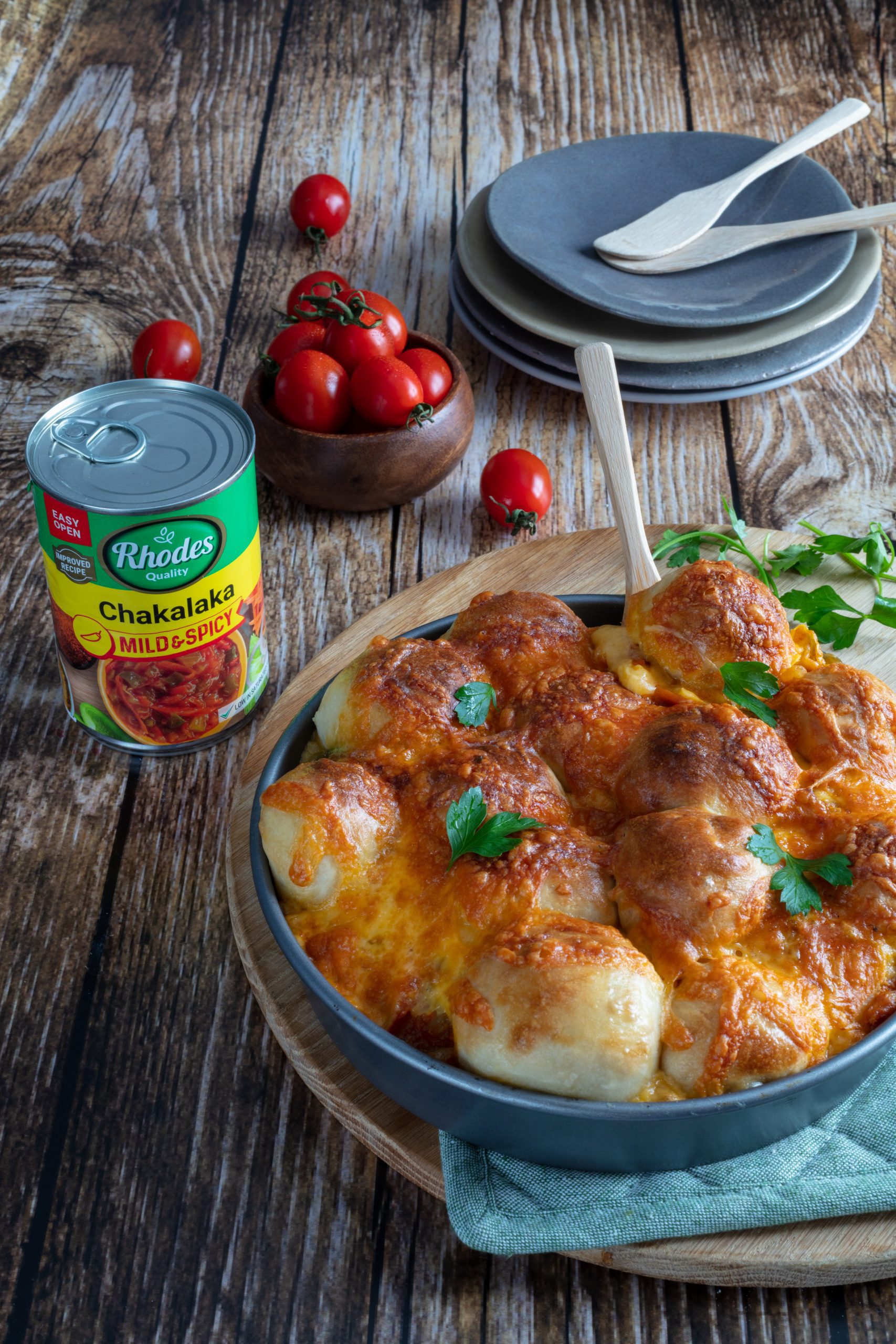 - Spoon the drained Rhodes Quality Chakalaka over the top of the buns and sprinkle with half the grated cheese.