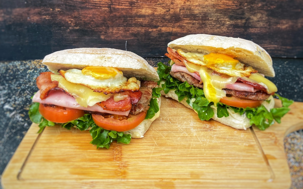 - Cut the sandwich rolls in half and spread them inside with mayonnaise. Add lettuce, tomato slices, steak, cooked ham, bacon and then mozzarella cheese. Melt the cheese in the microwave or under a hot grill, and then add the eggs. Close the sandwich and serve.