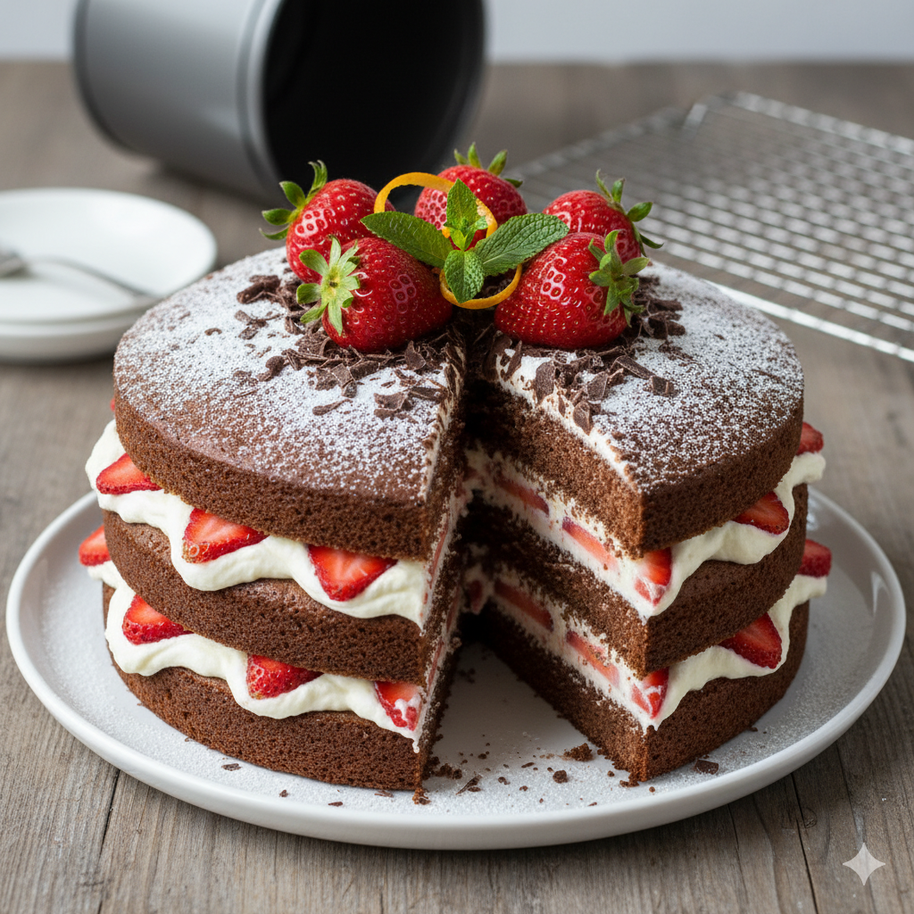 Rich chocolate sponge layered with whipped cream and juicy strawberries, finished with a flourish of chocolate flakes and fresh zest. A true celebration cake.