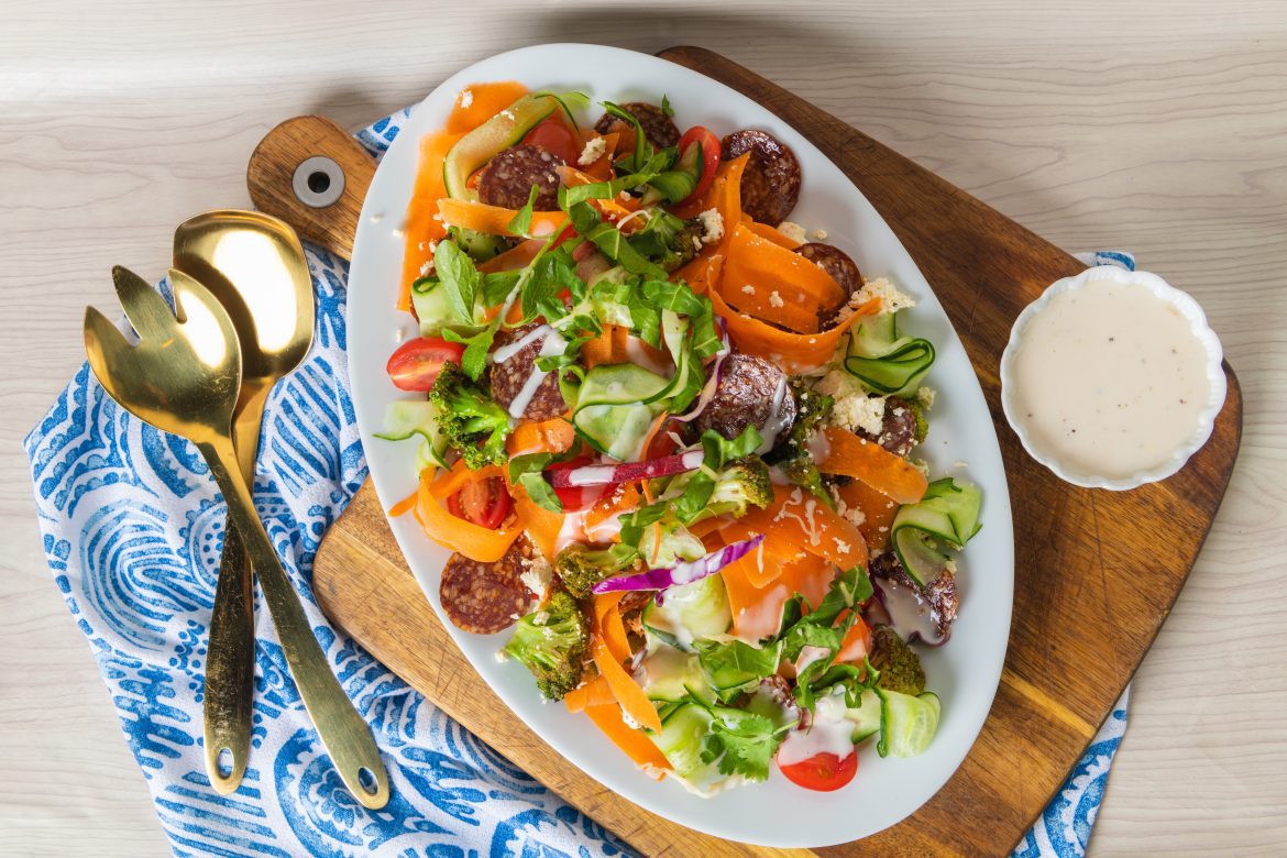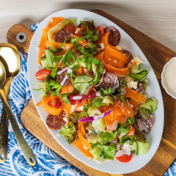 3.Assemble the salad in the flat ceramic dish starting with carrot shavings, followed by broccoli, cucumber, cocktail tomatoes, chorizo and drizzle the dressing all around the salad and add crumbled feta cheese. Garnish with parsley and coriander.