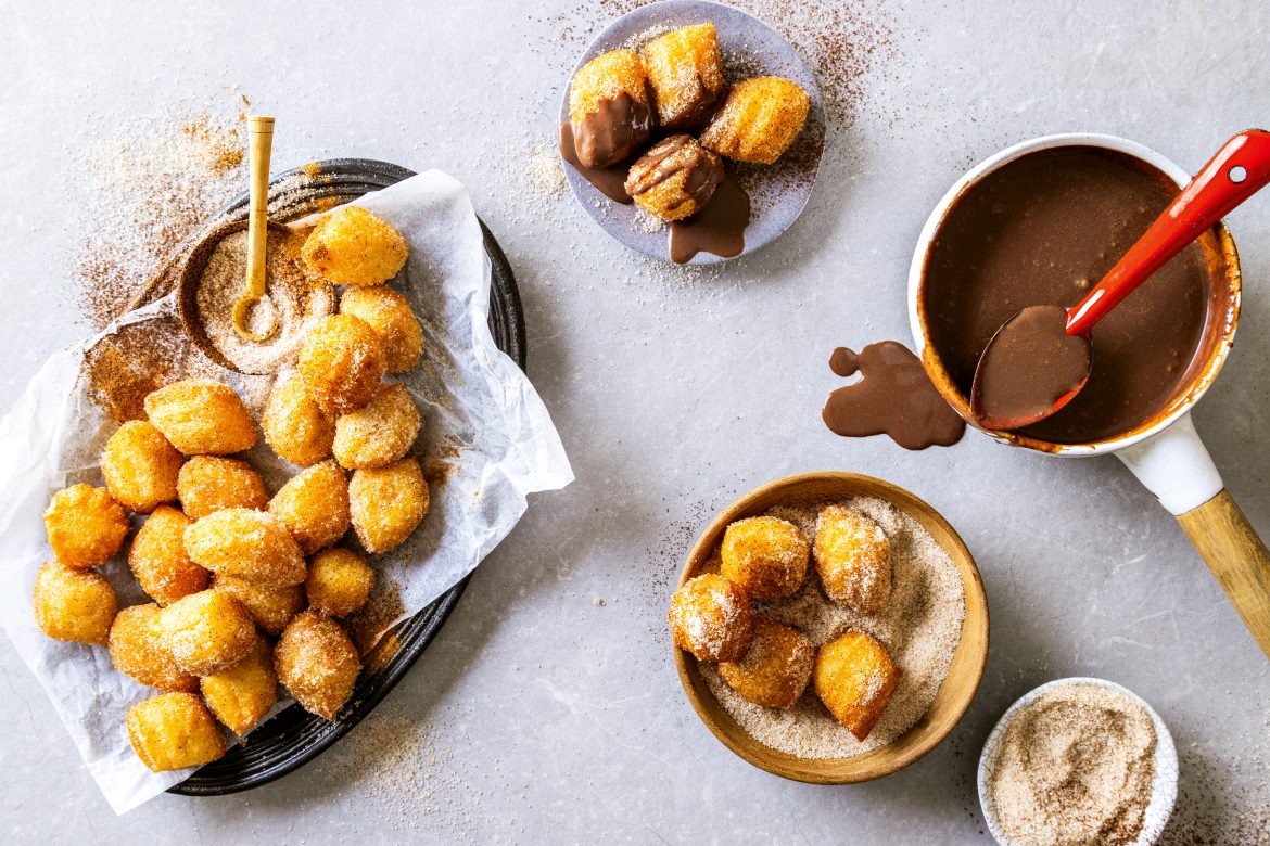 - Remove the churros with a slotted spoon and roll them in the cinnamon sugar. Serve hot with a side of chocolate ganache sauce.