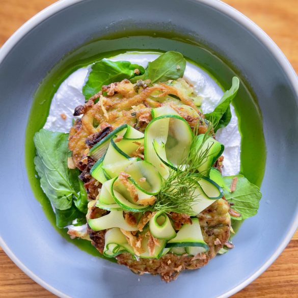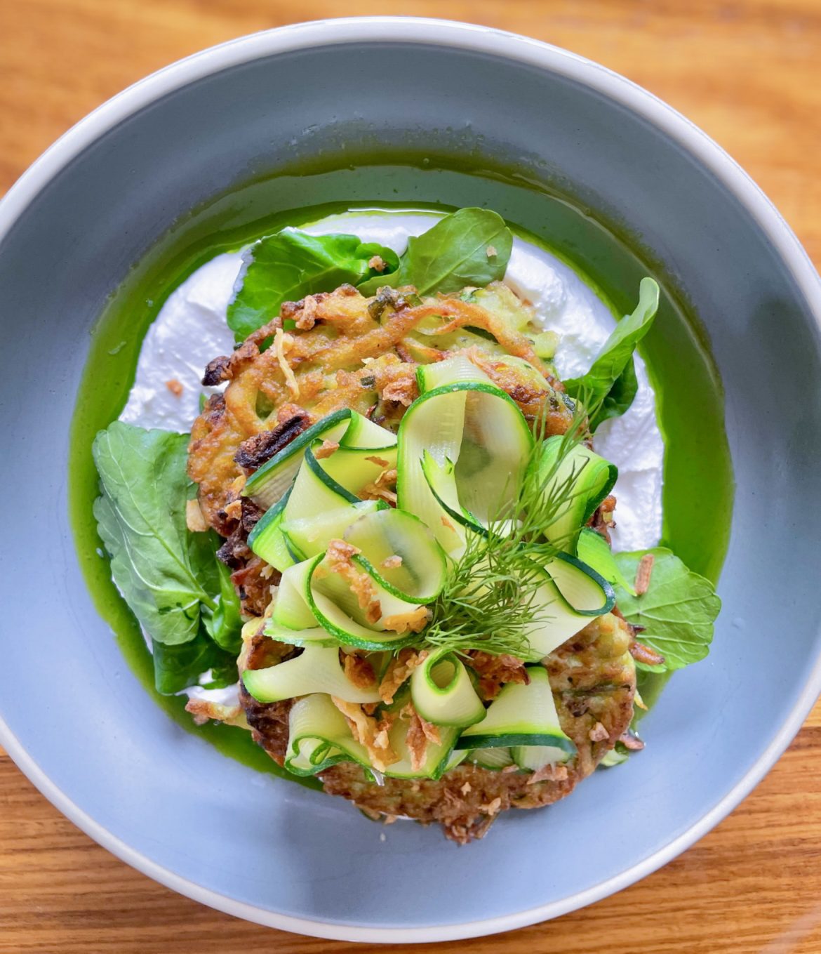 Crisp-edged courgette fritters with plenty of golden colour and a light, herb-flecked interior. I mix a spoonful of the herb oil pulp into the batter and serve it with whipped feta, a drizzle of herb oil, blanched baby marrow ribbons and crispy shallots. Fresh, simple and full of spring flavour.