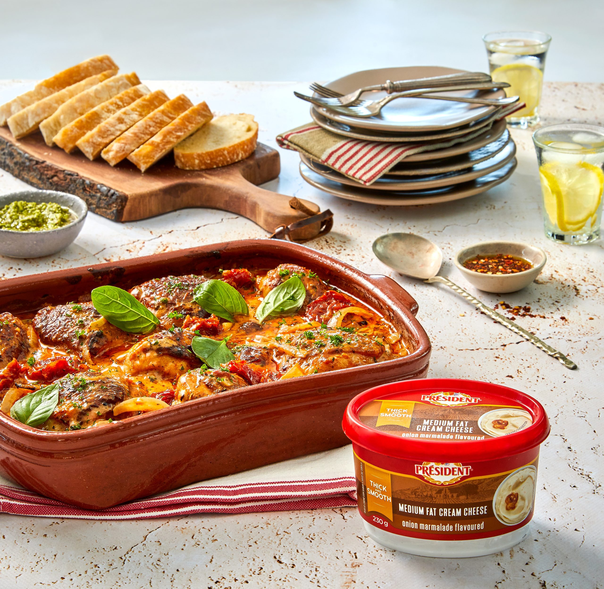 - In the same pan, sauté garlic and sliced yellow pepper for 2–3 minutes. Add sun-dried tomatoes. Stir in the Président Onion Marmalade Cream Cheese and chicken stock (plus cream if using) to form a smooth sauce.