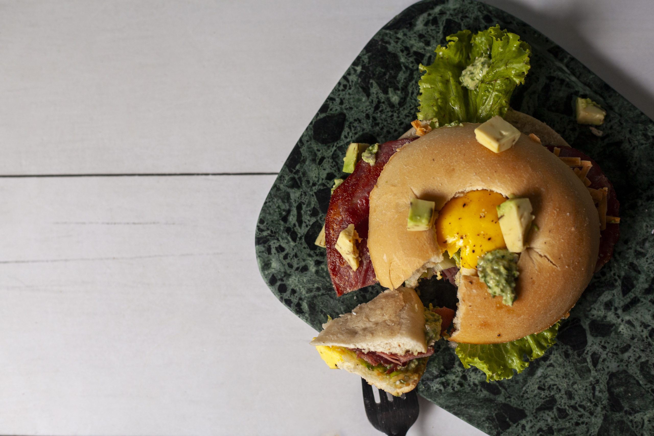 4. In a bowl, toss together the avocado, rocket, dill, lemon, sesame seeds, chilli flakes, and salt. Serve with the bagel. Add bacon for extra protein.