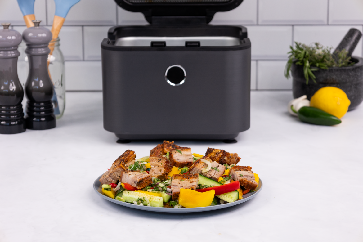 In a large bowl, combine mango, bell pepper, cucumber, red onion, spring onion, and coriander. Add the pork belly pieces on top. - Whisk together lime juice, soy sauce, honey, sesame oil, ginger, and chilli flakes (if using). Drizzle over the salad just before serving and toss lightly.