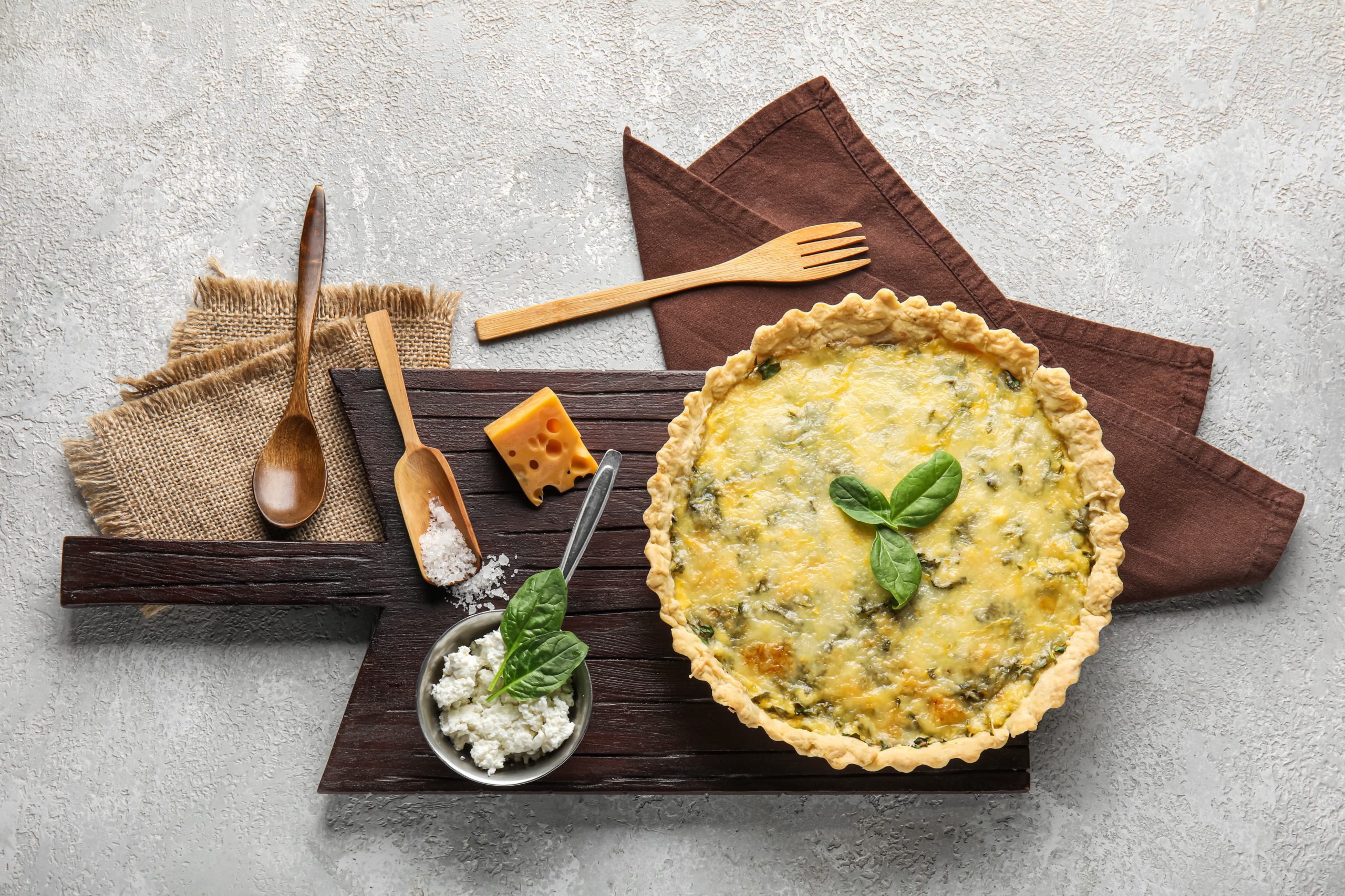 Roll out the pastry to fit a 22cm quiche tin. Line the tin with the pastry, prick the base with a fork, and chill for 10 minutes. - Spoon the spinach and cheese filling into the pastry shell. Bake in a preheated oven at 180°C for 30–40 minutes, or until the filling is golden and set.