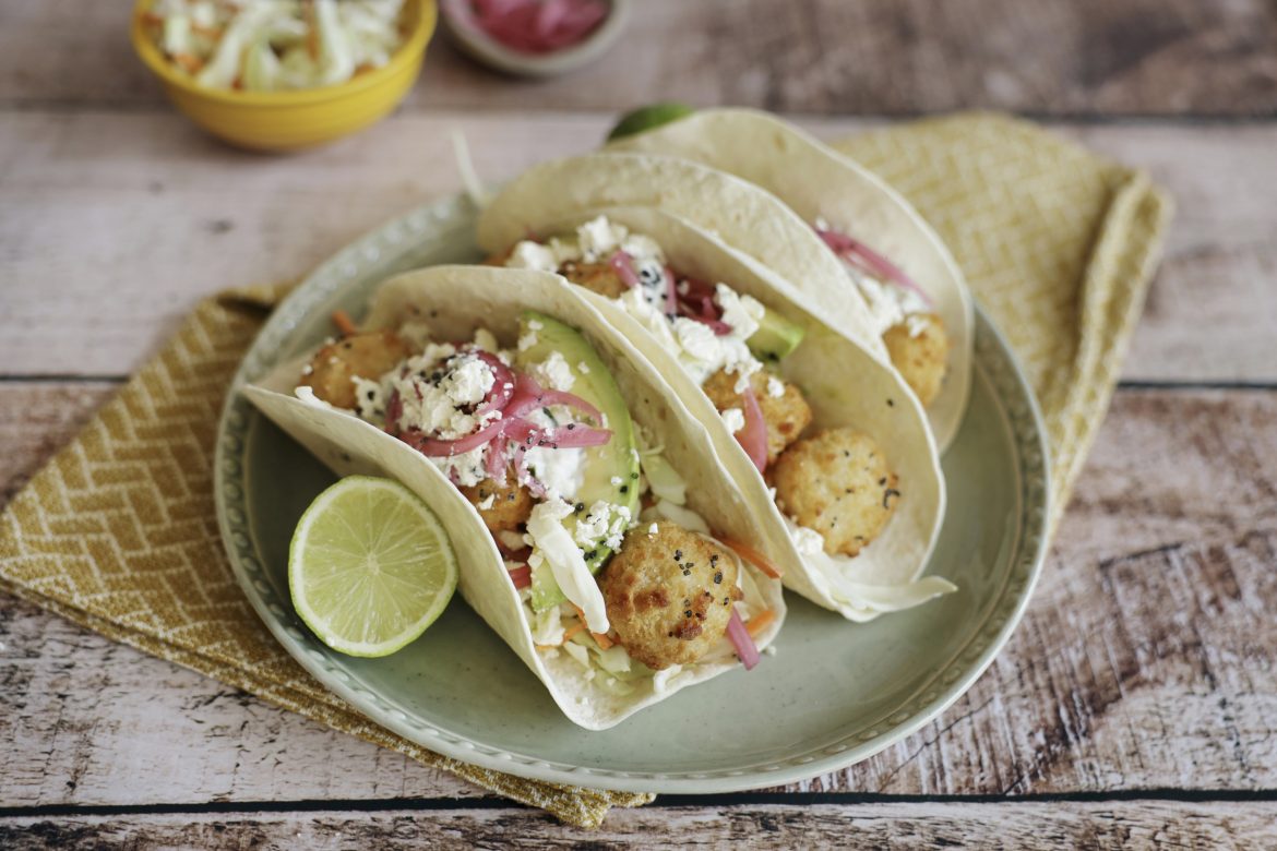 1. Lay a taco/wrap flat on a plate. Add a small handful of coleslaw, then top with 3-4 hake nuggets.
