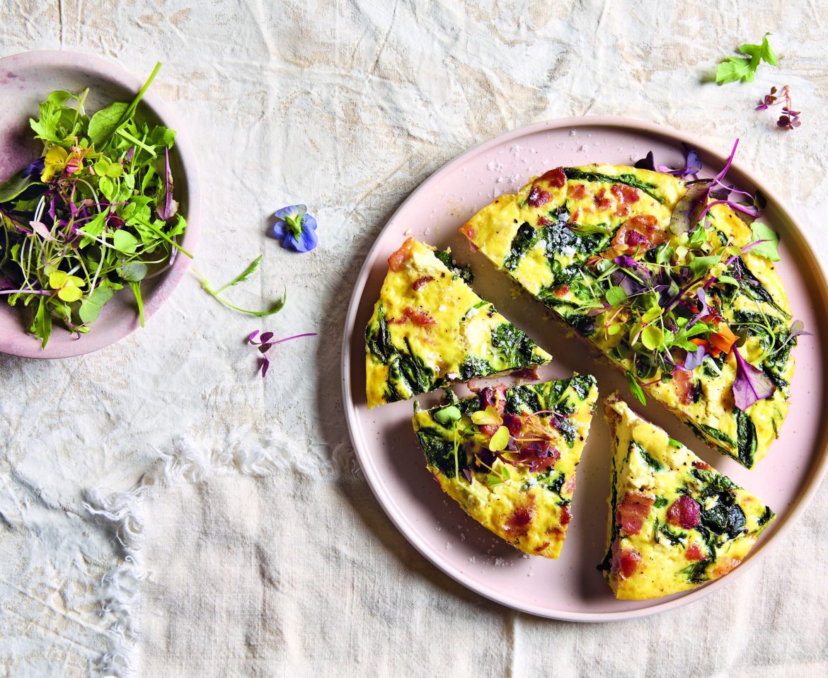 - Fry the bacon in a little olive oil in a medium-sized ovenproof pan for 3–4 minutes, or until it is lightly golden. Stir in the spinach until it wilts.