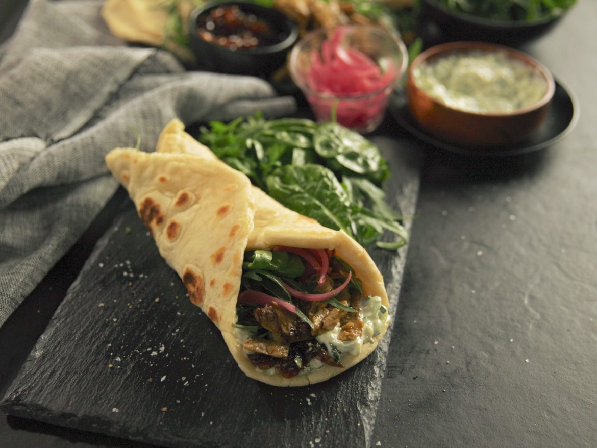 - Start with a lightly toasted flatbread or naan, top with tzatziki, caramelised onions or onion marmalade, cooked Pieces, pickled red onions and fresh greens of your choice.