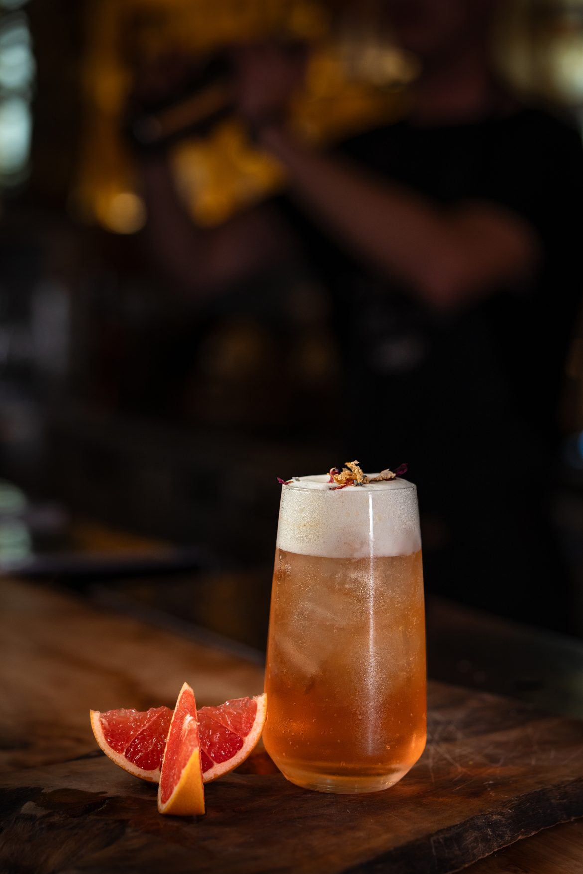 - garnish: sour peach foam & crushed flowers
