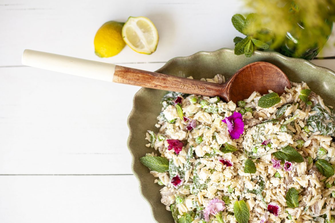3.In a large bowl, combine the orzo and peas with cucumber, lamb, spring onions, lemon zest, and fresh mint and spinach or rocket. Toss gently with the dressing.