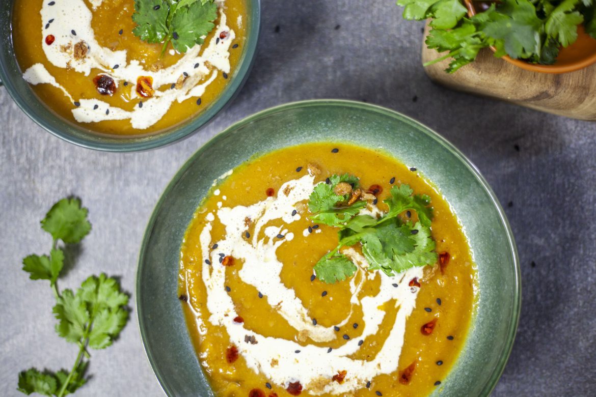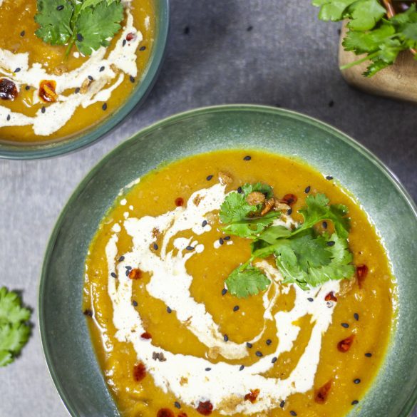 8. Season the soup with lime juice and serve it topped with a bit of coconut cream, fresh coriander, and sesame seeds.