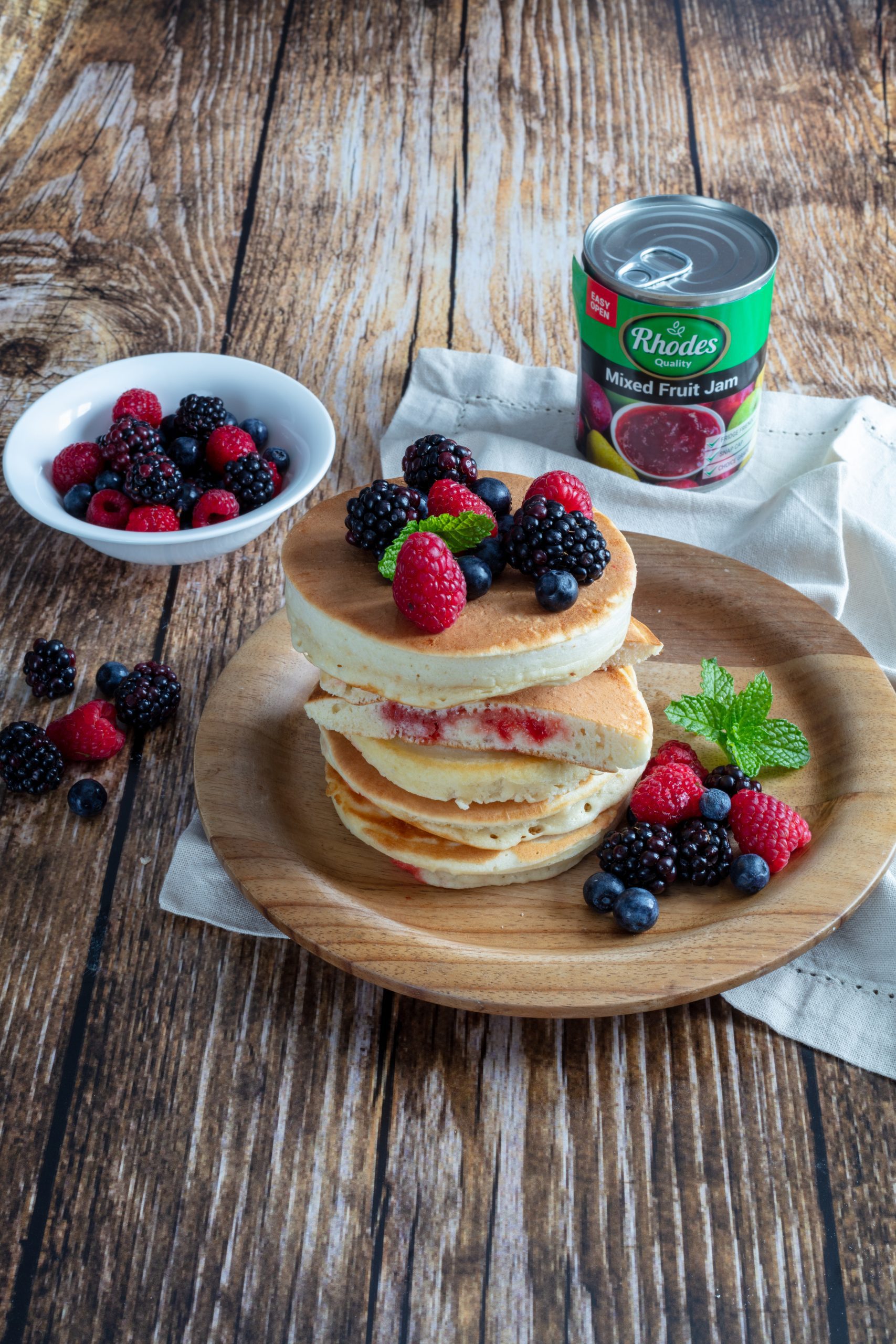 - Spoon 5ml of Rhodes Quality Mixed Fruit Jam into the centre and use a teaspoon to cover the jam with extra batter.