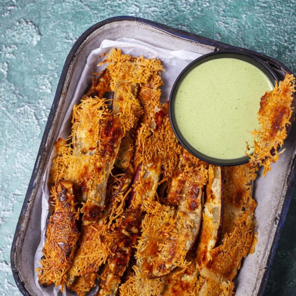 2. Cover the sweet potatoes with your seasoning and oil, then place them cut side down onto the parmesan. Bake for 40-45 minutes.