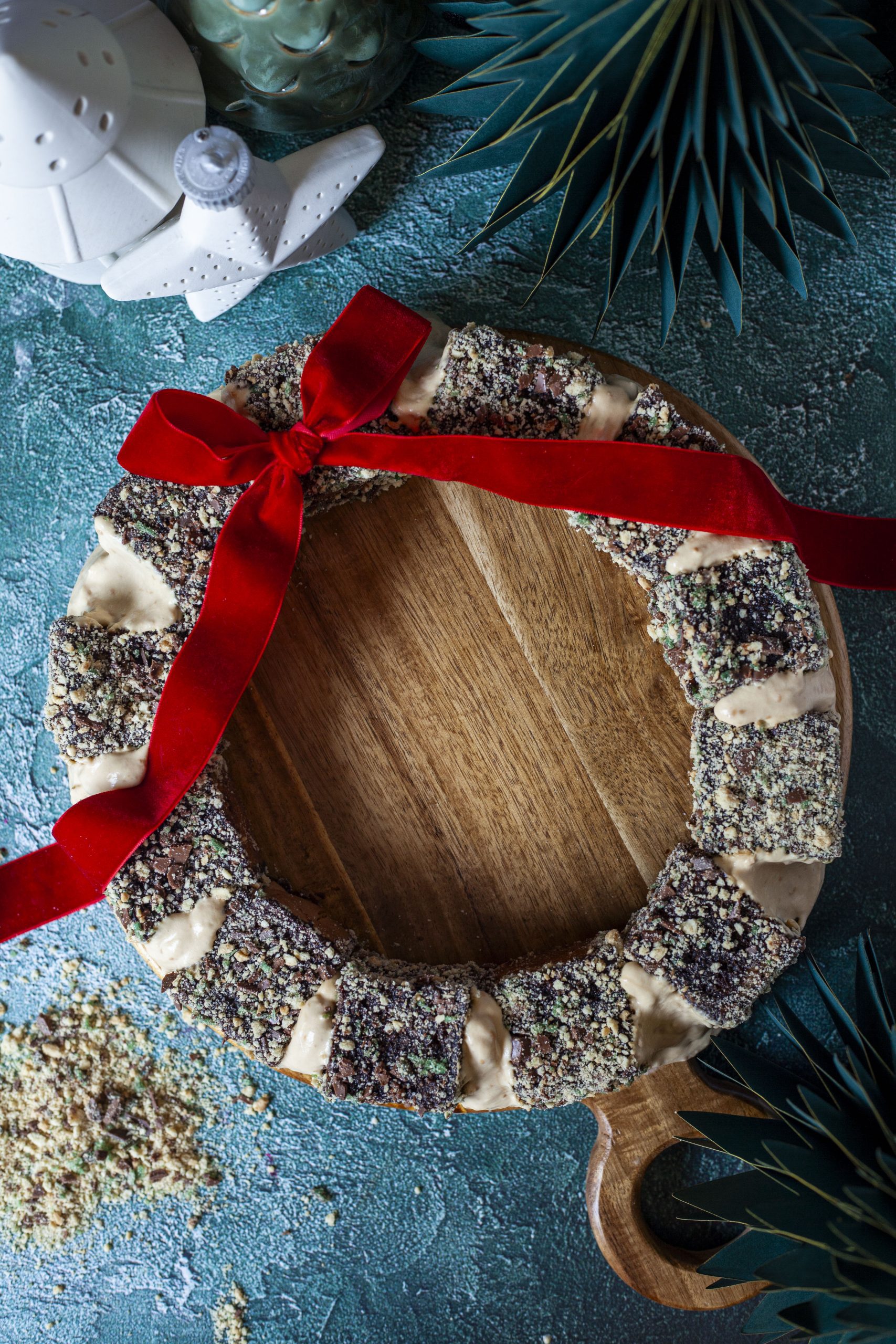 - Place a bowl in the centre of a round wooden board. Stack the lamington pieces in a circle around it to form a wreath.
