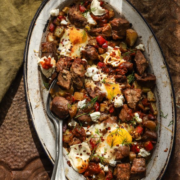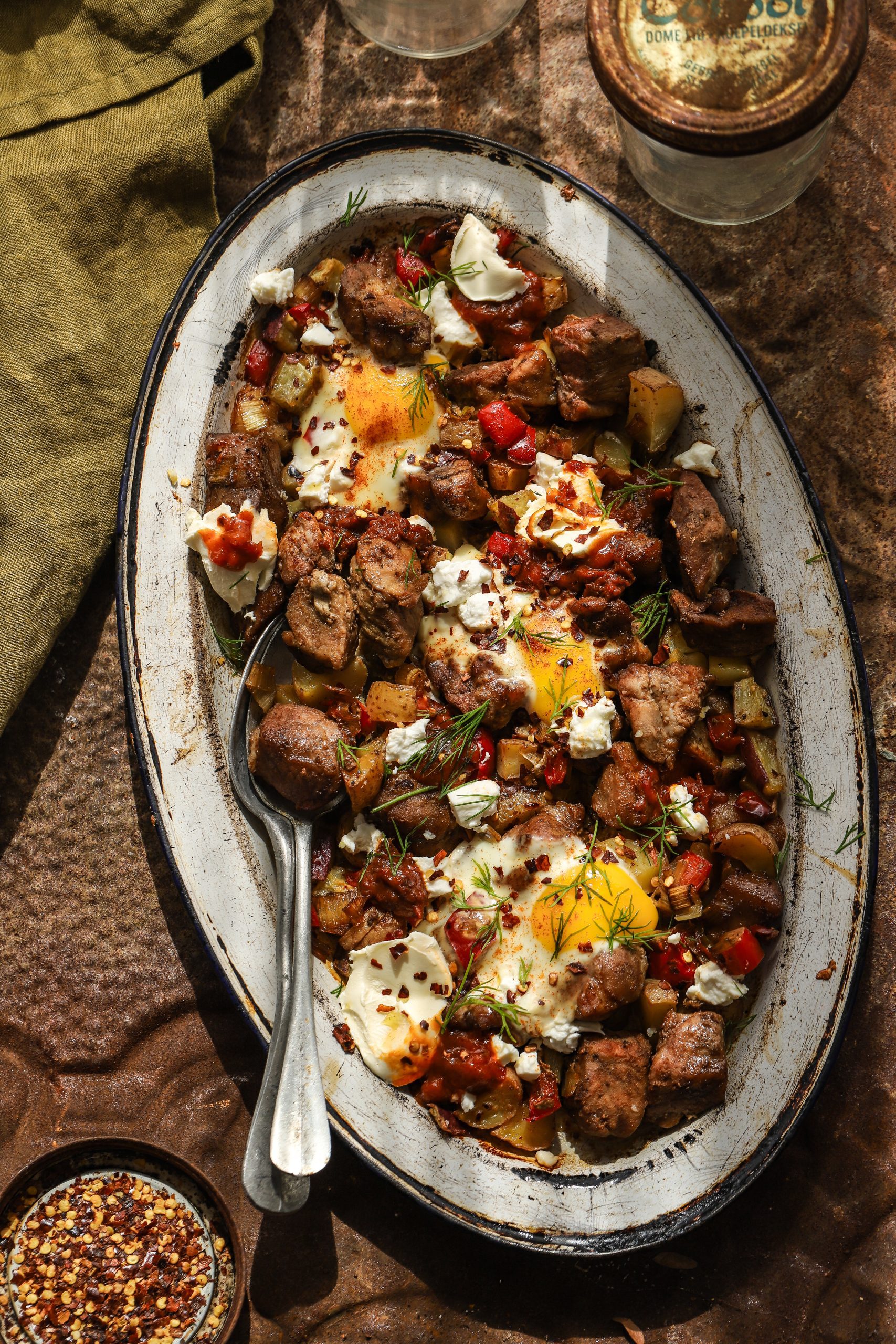 This hearty breakfast hash features tender pork shoulder goulash, seasoned with smoked paprika and cumin, baked with eggs, and topped with feta and cream cheese. The addition of bell peppers and onions adds extra flavour and nutrition. Enhanced with sun-dried tomato paste, chilli flakes, and fresh dill, this dish is a comforting and satisfying start to your day.