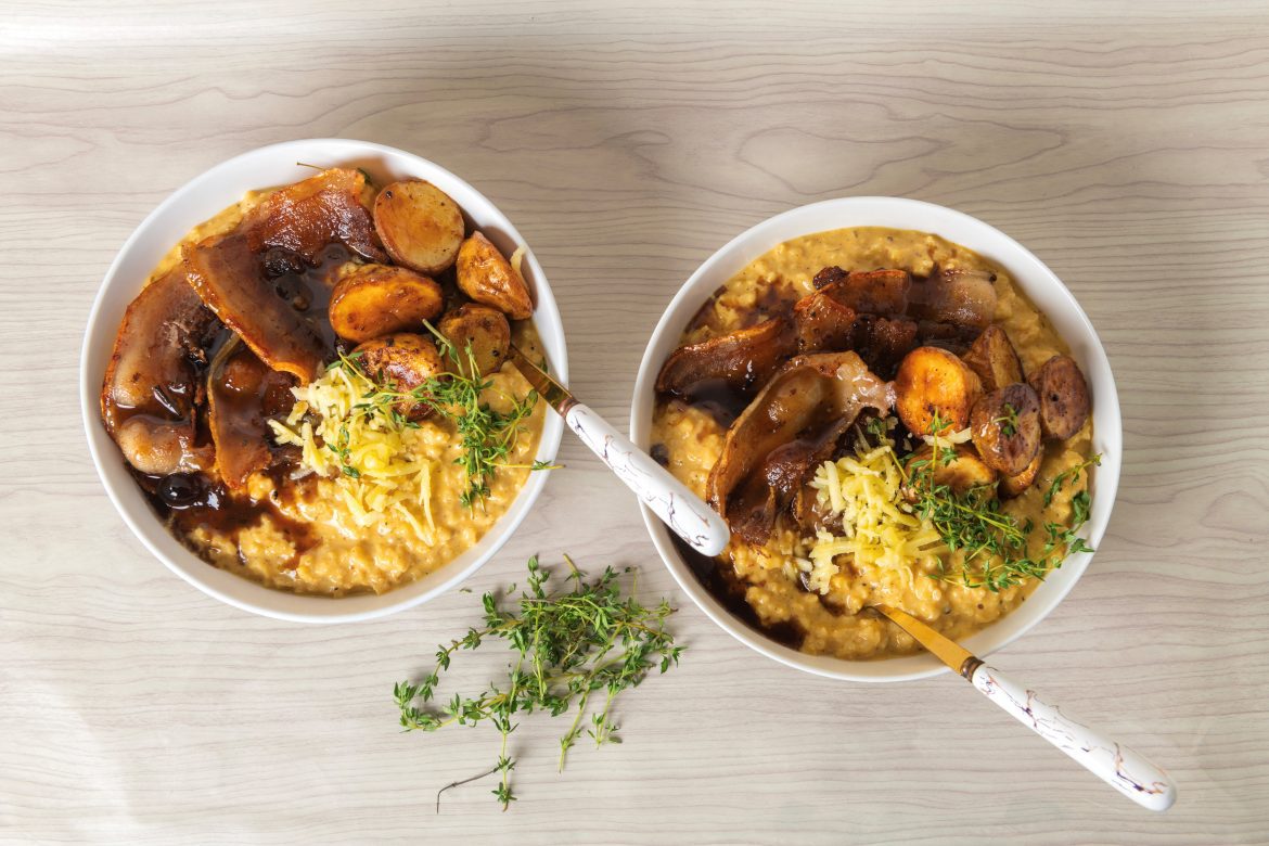 3.Serve immediately with the risotto, baby potatoes, and maple syrup gravy. Garnish with parmesan cheese and fresh thyme.