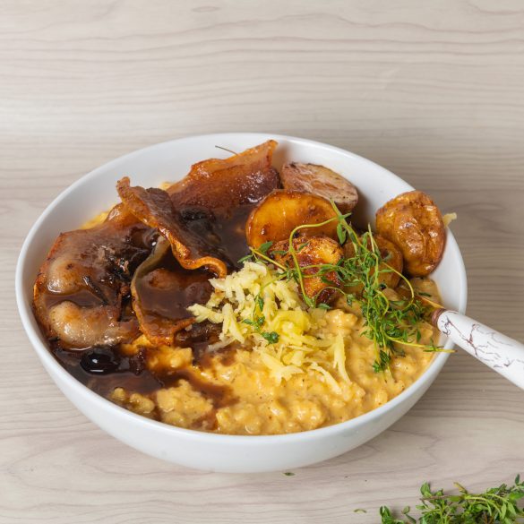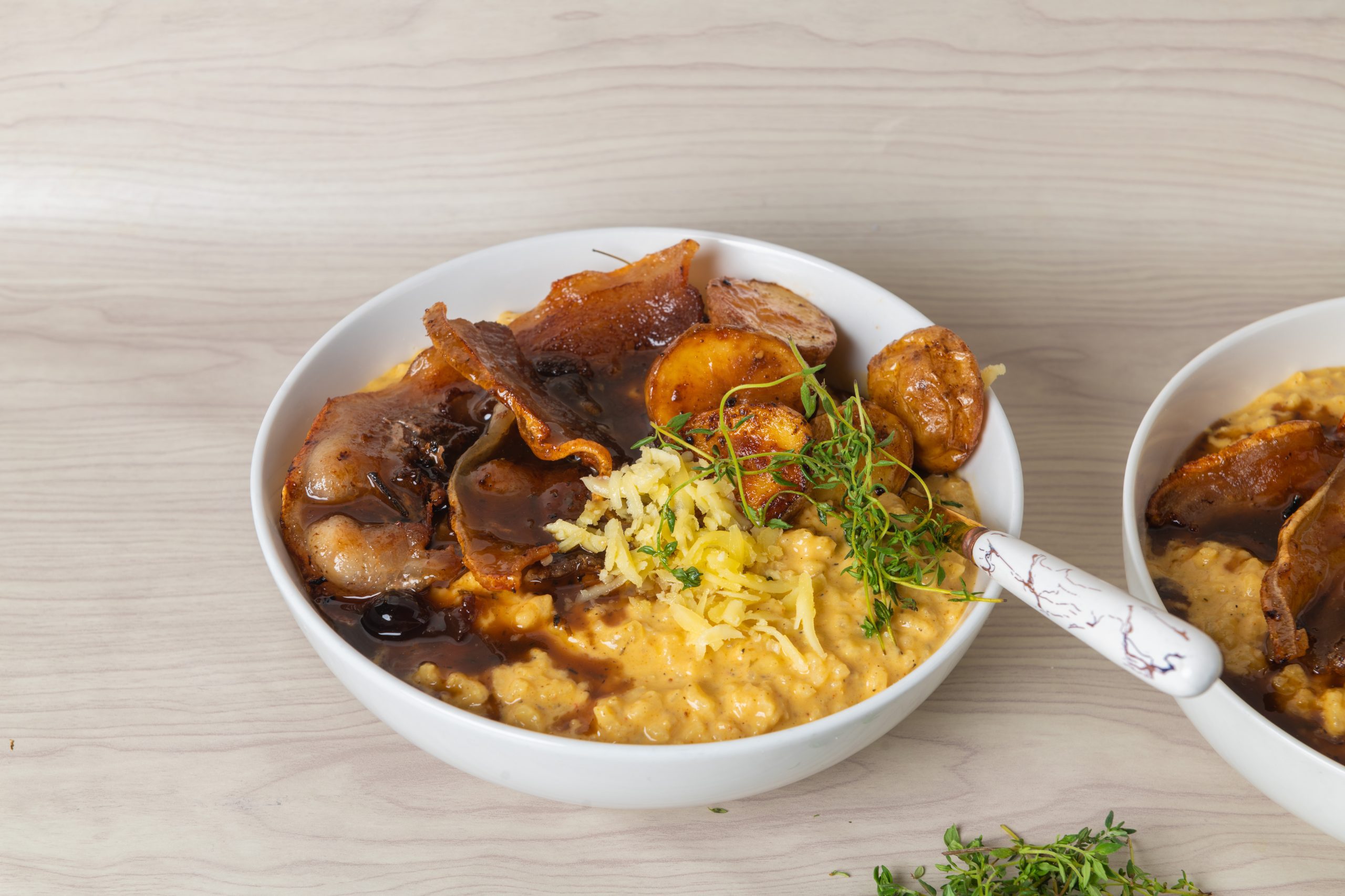 3. Serve immediately with the risotto, baby potatoes, and maple syrup gravy. Garnish with parmesan cheese and fresh thyme.