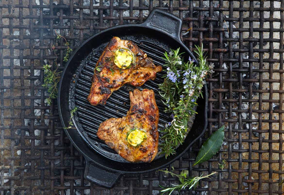 - Remove from the heat and place a cast-iron pan on the grid to heat up. Add a generous dash of olive oil (this keeps the butter from burning) and then add a slice of flavoured butter to the pan.