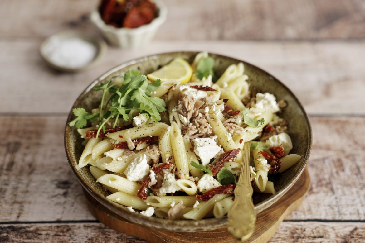 2. Drain the tuna and add it to the pasta. Crumble about half a round of feta cheese over the pasta.