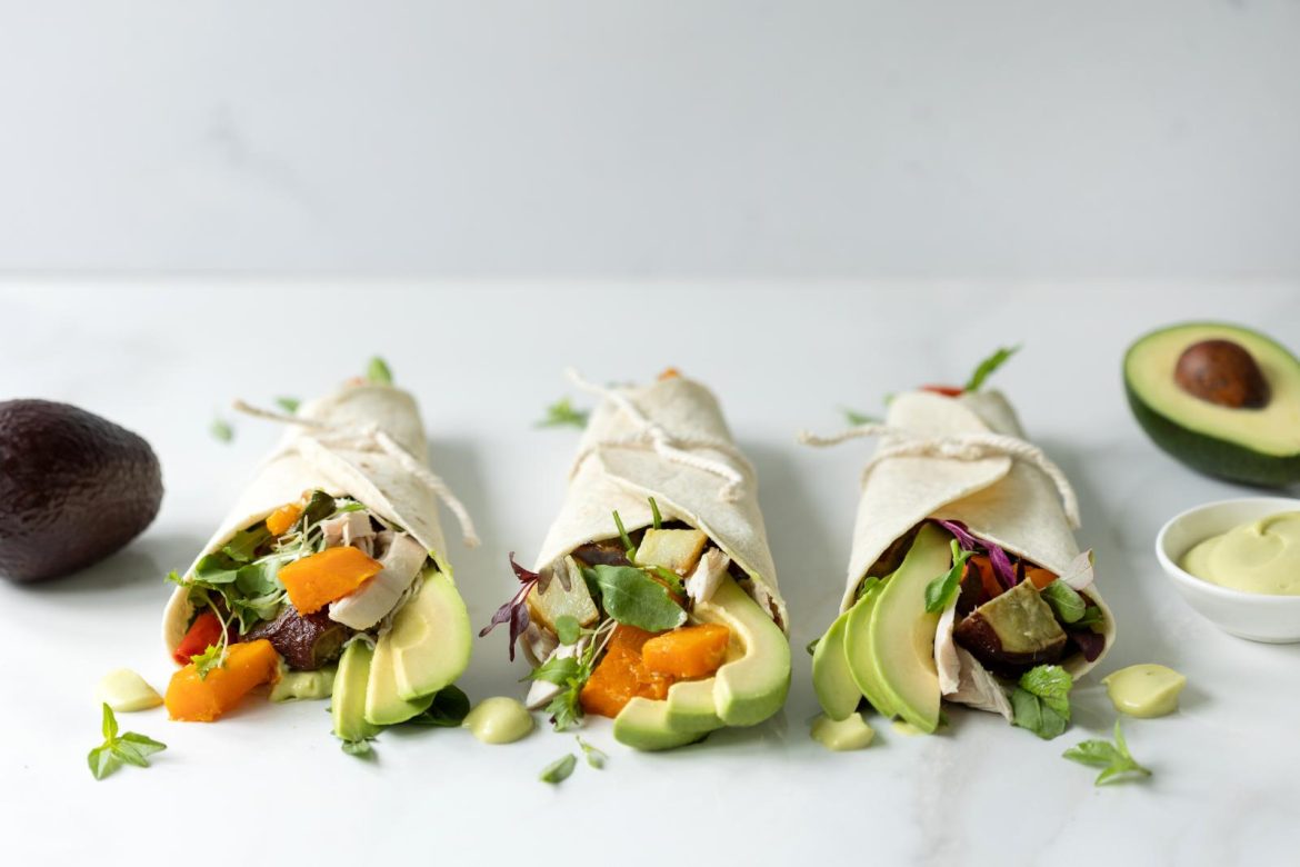 - For the wraps, spread the avo mayo in lines down the middle of the wraps. Top with leaves, veggies and avocado. Fold both sides of each wrap over the filling. Tie up with kitchen string to hold it together.