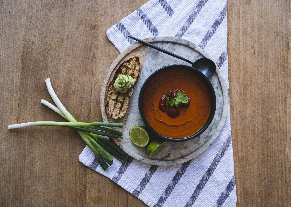- Place on an oven tray the halved tomatoes, garlic cloves, red onion, red pepper, chilli and thyme. Season with salt & pepper, drizzle olive oil, and roast in the oven for 35-40 minutes.