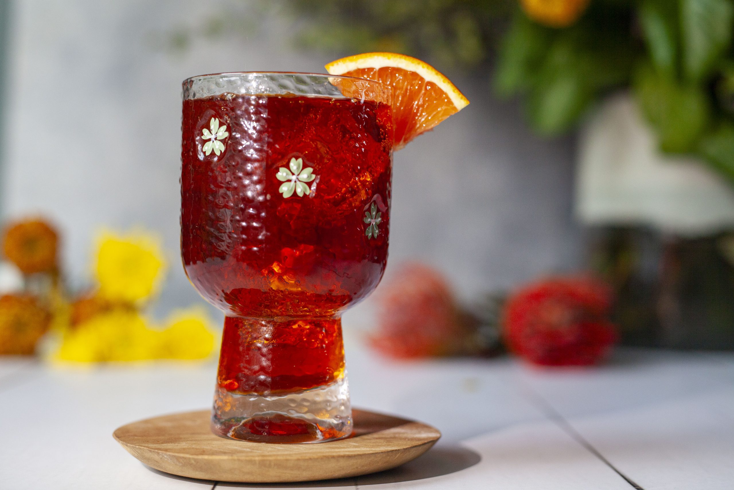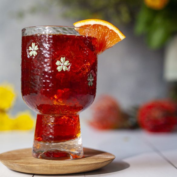 2.In a glass or jug, stir together cooled rooibos, orange juice, and sweetener if using.