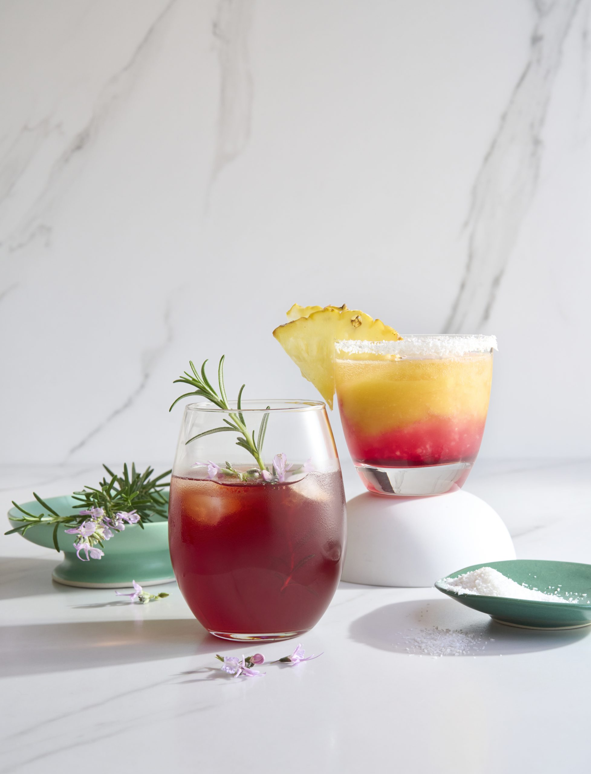 - Mix the juice and rosemary into the tea. Add edible flowers if desired, then serve ice-cold with ice cubes.