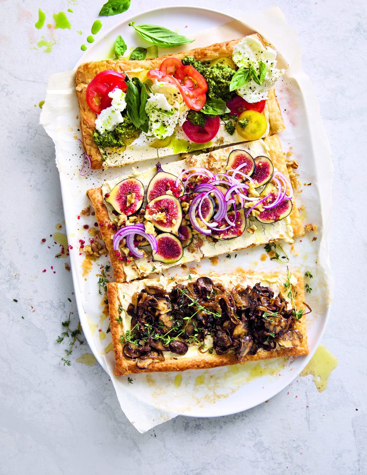 - Caramelised onion & mushroom: While the tart shell is baking, heat the olive oil in a saucepan and sauté the onions and mushrooms until they are sweet and caramelised. Finish with thyme and Dijon mustard, and stir well. Top the tart shell with the caramelised onions and mushrooms. Season with salt.