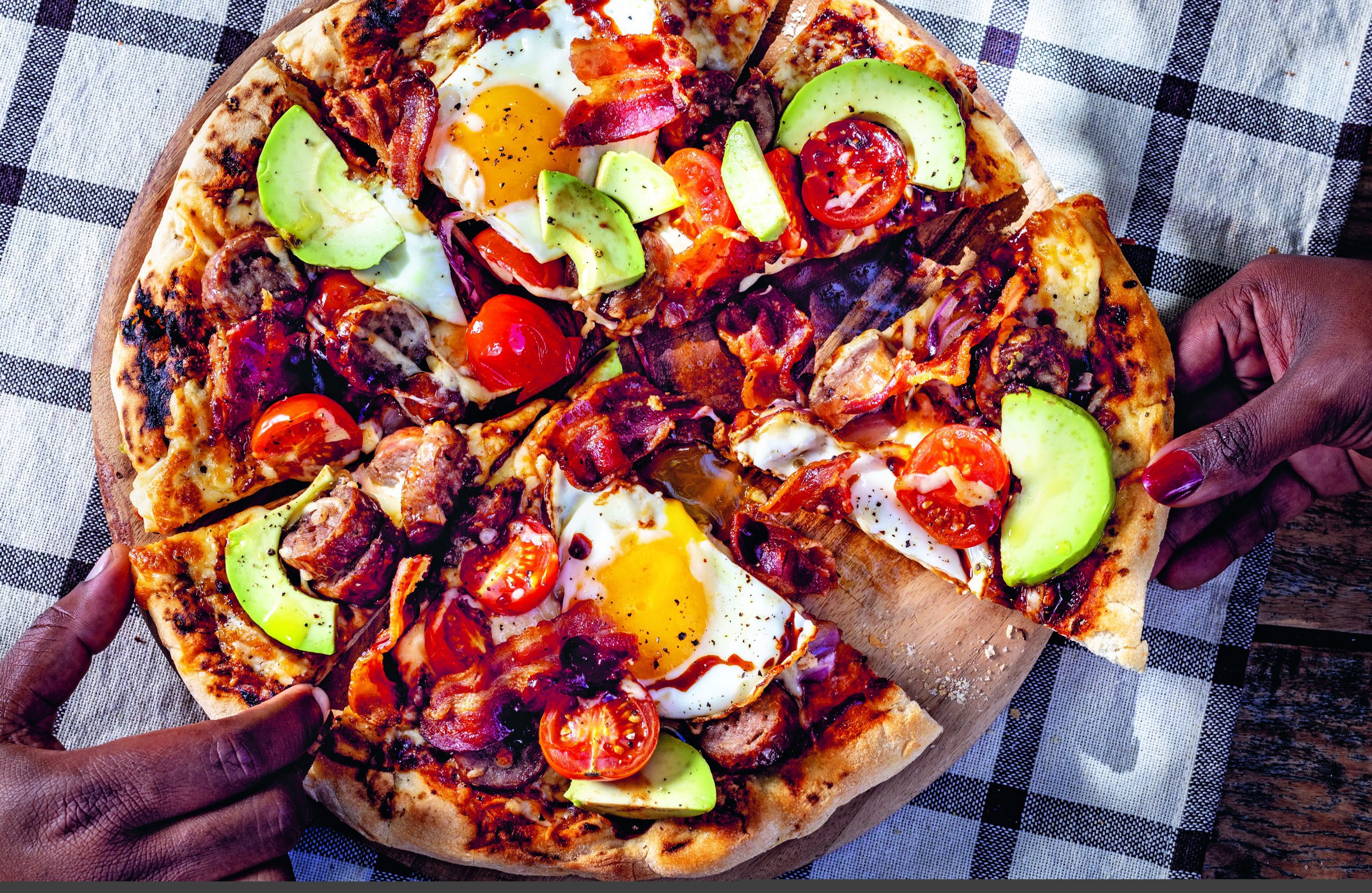 - Place the pizza in the preheated oven and bake for 12–15 minutes, or until the crust is golden-brown, the cheese is melted, and the egg whites are set but the yolks remain runny.