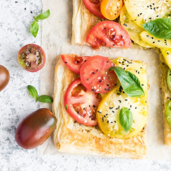 5.Spoon the basil pesto onto the pastry, stopping at the border.