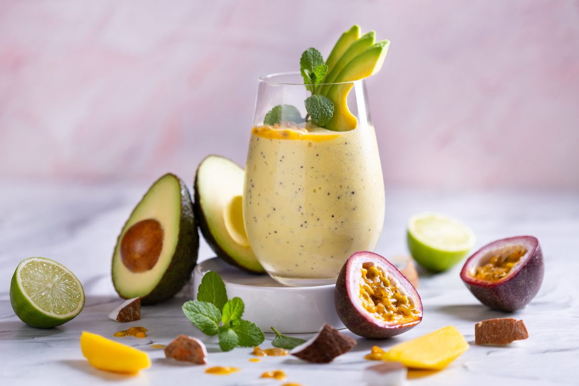 Garnish with mint, avocado slices and granadilla pulp.