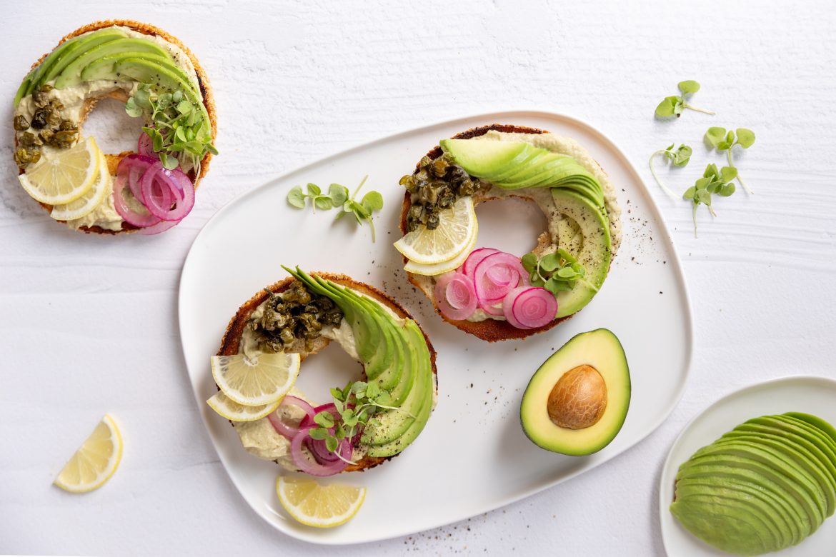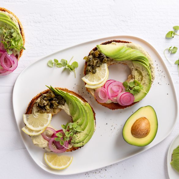 4.Spread the toasted bagels generously with the tuna aioli. Layer with the remaining avocado slices, seasoned lightly with salt and freshly ground black pepper. Finish with a scatter of capers.