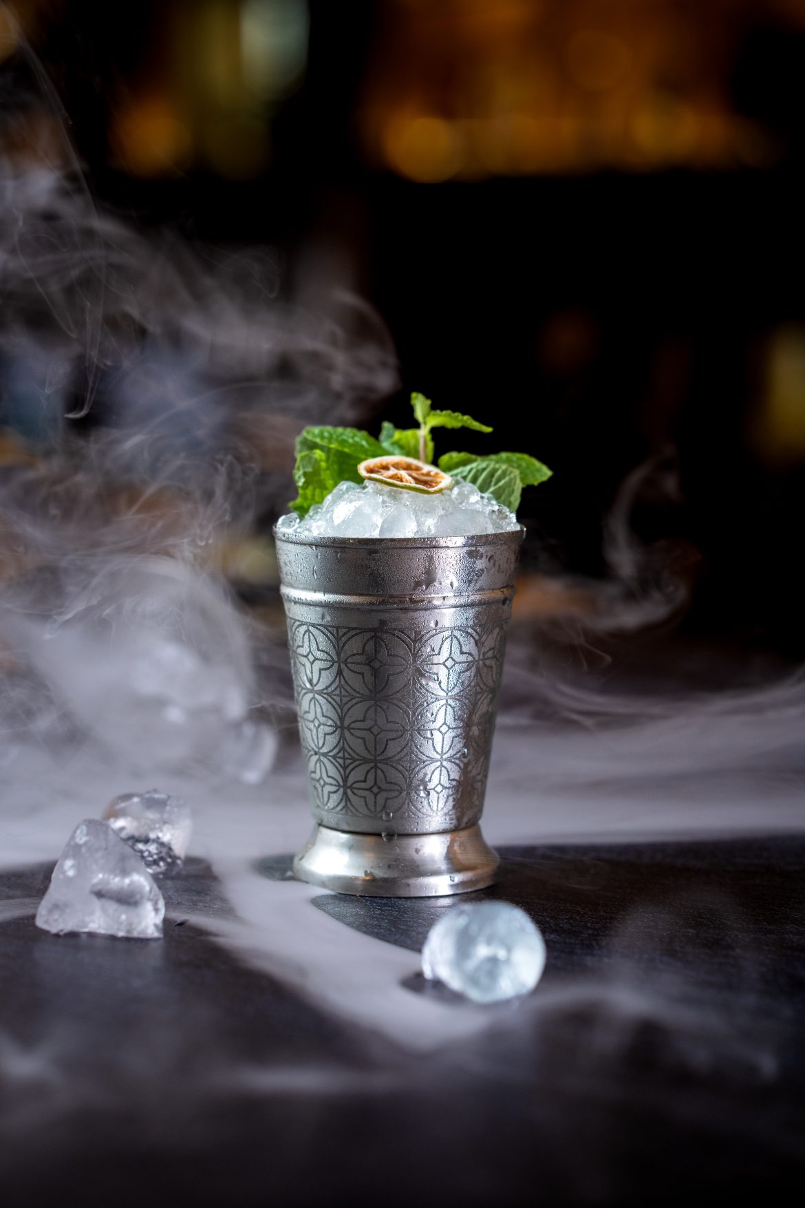 1.Tear mint, lightly muddle, add ingredients to a julep cup with crushed ice.