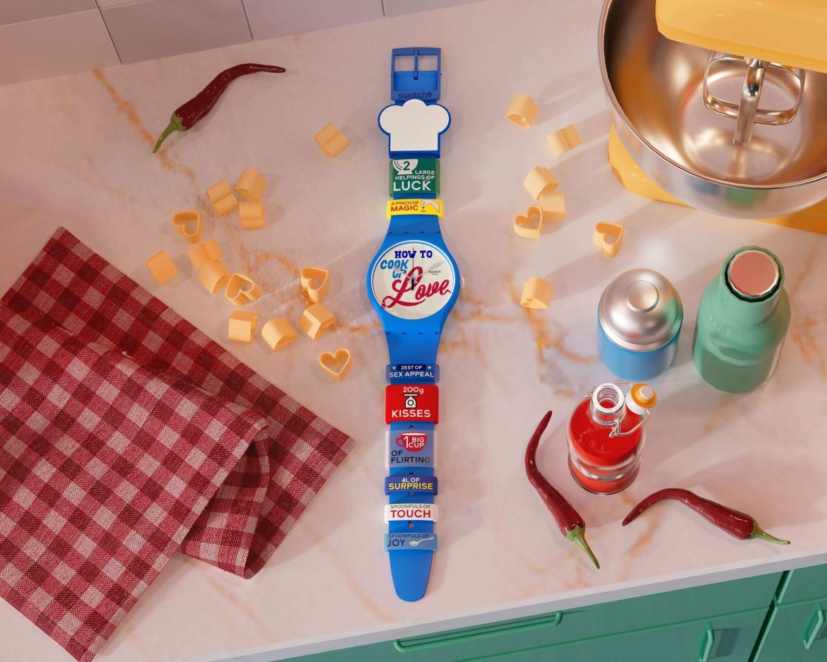 “Treat dates and mates with a Swatch special. RECIPE FOR LOVE dials up the playfulness and customization with nine different watch strap loops and hands in the shape of a knife and fork. The back of the watch strap features a red and white chequered tablecloth pattern for an extra fun touch. The idea is for the wearer to create their own recipe for love with the nine watch strap loops that include zest of sex appeal, a pinch of magic, 4 liter of surprise, spoonfuls of touch, spoonfuls of joy, 1 big cup of flirting, 2 large helpings of luck, 200g of kisses, and a chef’s hat symbol.”