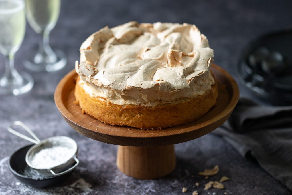 - Working quickly, carefully spread the meringue evenly over the top of the cake. Bake for about 30 minutes or until the meringue is crisp. Cool. Turn out onto a cake stand and dust with icing sugar.