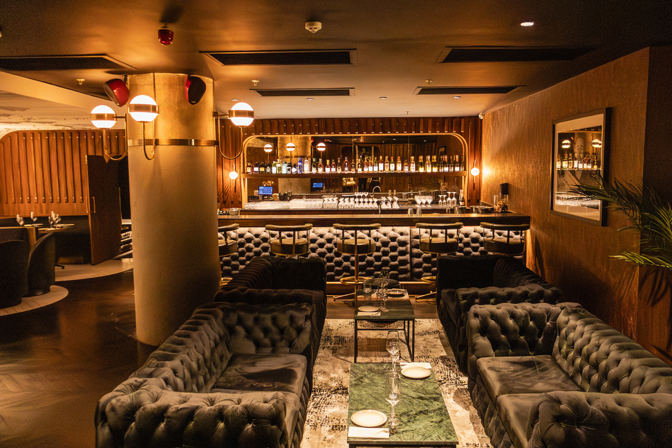 In the main dining room, the bar is crowned by a sculptural figure. An illuminated wine collection is displayed behind blackened steel and timber. Brown curved leather seating and reflective panels create warmth and understated luxury.