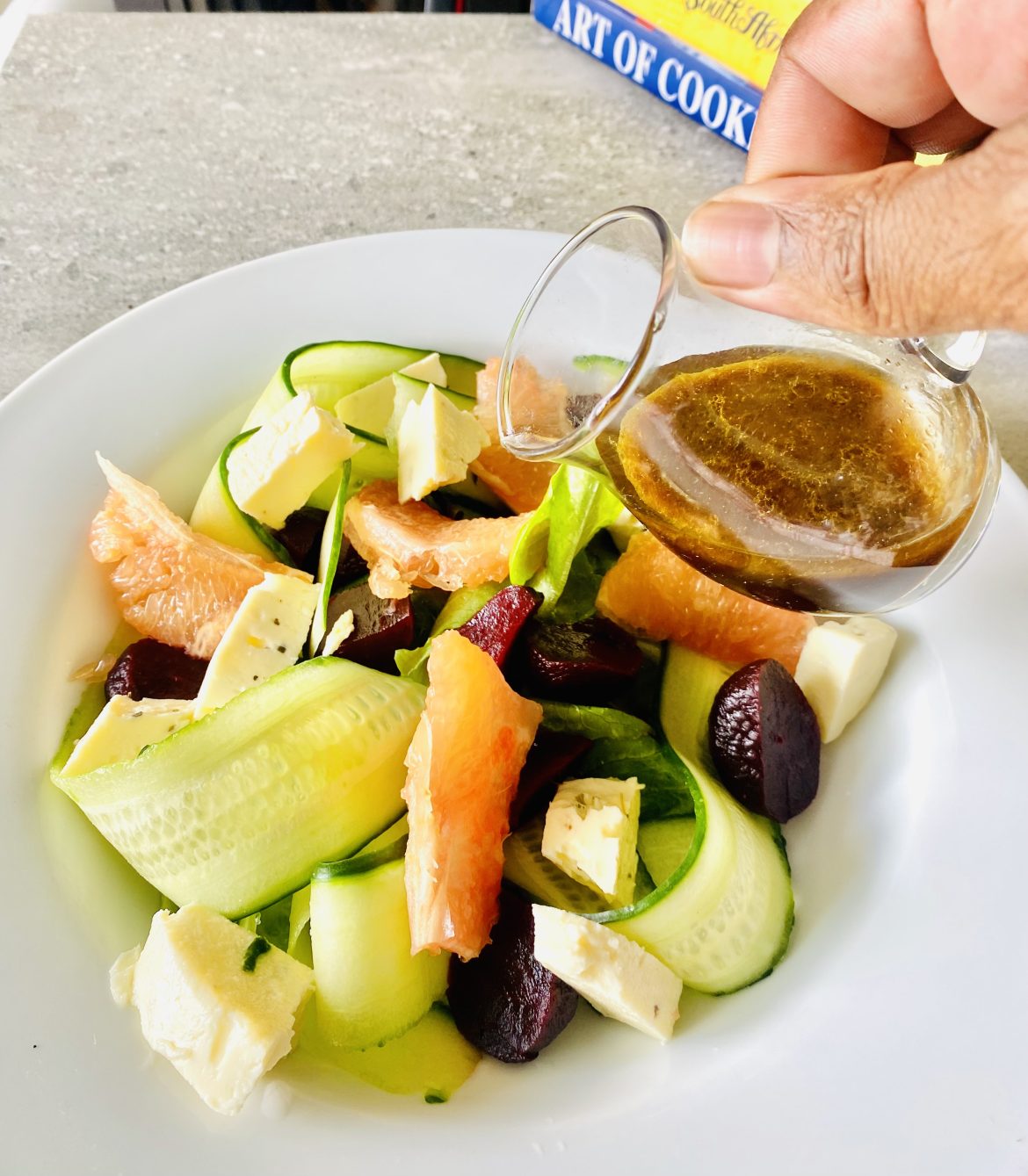 - In a large salad bowl, combine the cooked and sliced baby beetroot, crumbled feta cheese, cucumber ribbons, grapefruit segments, and mixed lettuce leaves.